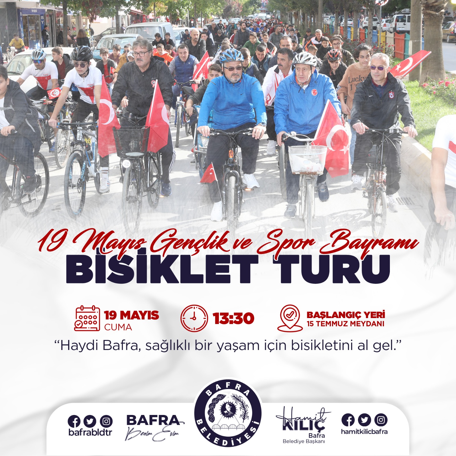 Bafra Belediyesi Spor İşleri Müdürlüğü tarafından organize edilecek olan 19 Mayıs Bisiklet Turu, 19 Mayıs 2023 Cuma günü Saat 13.30’da gerçekleştirilecek.