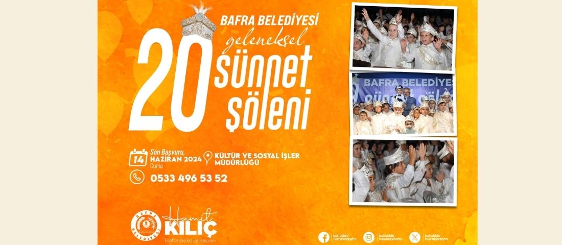 İleri bir tarihte gerçekleşecek ve duyurusu yapılacak olan Sünnet Şöleni için aileler, Bafra Belediyesi Kültür ve Sosyal İşler Müdürlüğü’ne başvurarak kayıtlarını yaptırabilecek ve 05334965352 numaralı telefondan detaylı bilgi alabilecekler.