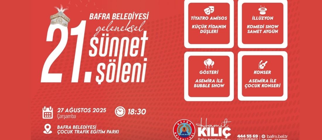 Kültür ve Sosyal İşler Müdürlüğü koordinasyonunda organize edilen ve bu yıl 21’incisi yapılacak olan Geleneksel Sünnet Şöleni, 27 Ağustos Çarşamba günü saat 18.30’da Bafra Belediyesi Çocuk Trafik Eğitim Parkı’nda gerçekleştirilecek.