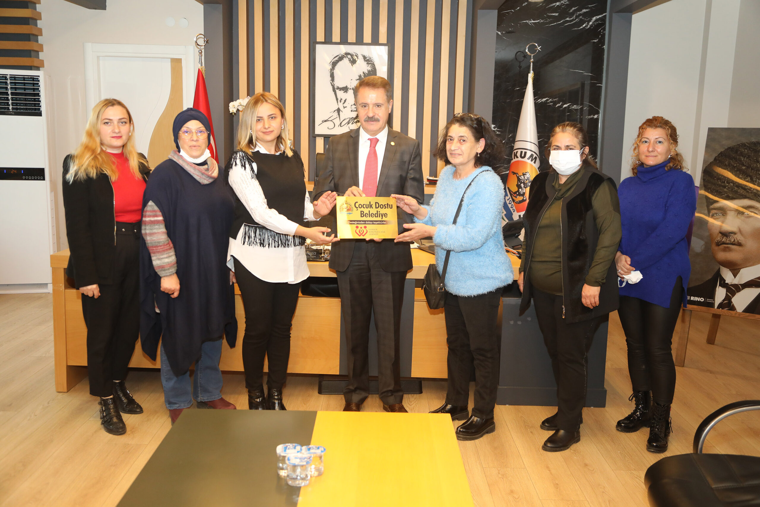 Samsun Koruyucu Aile Derneği, hayata geçirdiği çalışmalarla çocuk haklarını gözeten ve çocuk odaklı projelere destek veren Atakum Belediyesi’ni “Çocuk Dostu Belediye” ilan etti. Samsun Koruyucu Aile Derneği Başkanı Zeynep Çalış ve dernek üyeleri Atakum Belediye Başkanı Av. Cemil Deveci’yi makamında ziyaret etti. Ziyaret sonrasında Başkan Deveci ile Başkan Çalış birlikte belediye hizmet binasının girişine “Çocuk Dostu Belediye” levhası astı.
