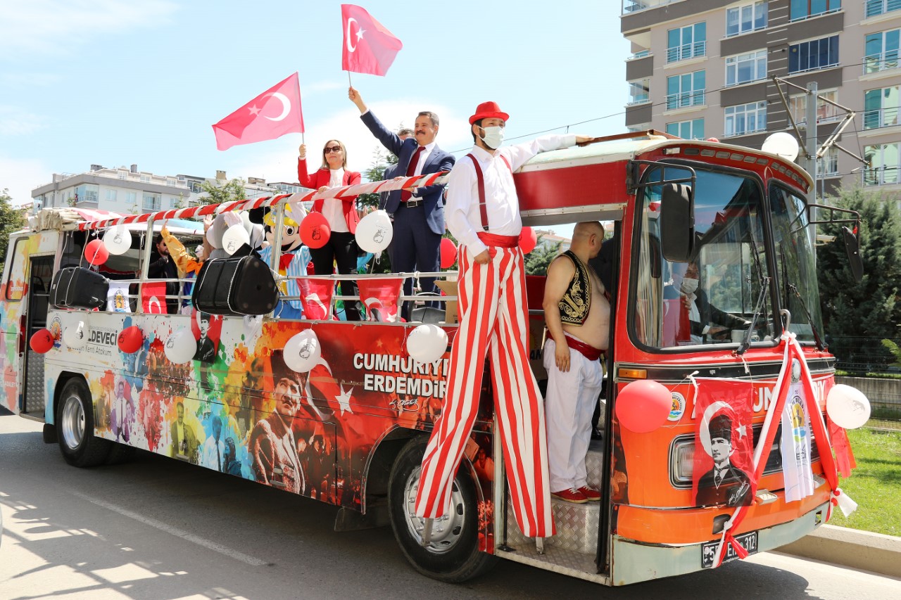 Atakum Belediyesi, Türkiye Büyük Millet Meclisi’nin (TBMM) açılışının 101. yılı olan 23 Nisan Ulusal Egemenlik ve Çocuk Bayramı kutlamalarını kısmi kapanma nedeniyle evlerinde kalan yurttaşlar için düzenlediği etkinlikle bayram coşkusunu kentin sokaklarına taşıdı. Sabah saatlerinden itibaren kırsal mahallelerde Atakum Belediyesi Paylaşım Merkezi ekiplerince miniklere 23 Nisan hediyeleri ulaştırılmaya başlandı. Öğlen ise üstü açık otobüs ve sokak gösterisi ekipleri Atakum’u dolaşarak balkonlarında bayram sevinci yaşattı. Atakum Belediye Başkanı Av. Cemil Deveci ile eşi Av. Gülay Deveci de üstü açık otobüsle şehir turu atarak Atakumlularla bayram coşkusunu paylaştı. Gündüz ve iftardan sonra da devam eden etkinlikte, ekipler Atakum’un sokaklarını dolaşarak yurttaşlara bayram coşkusunu ulaştırdı.