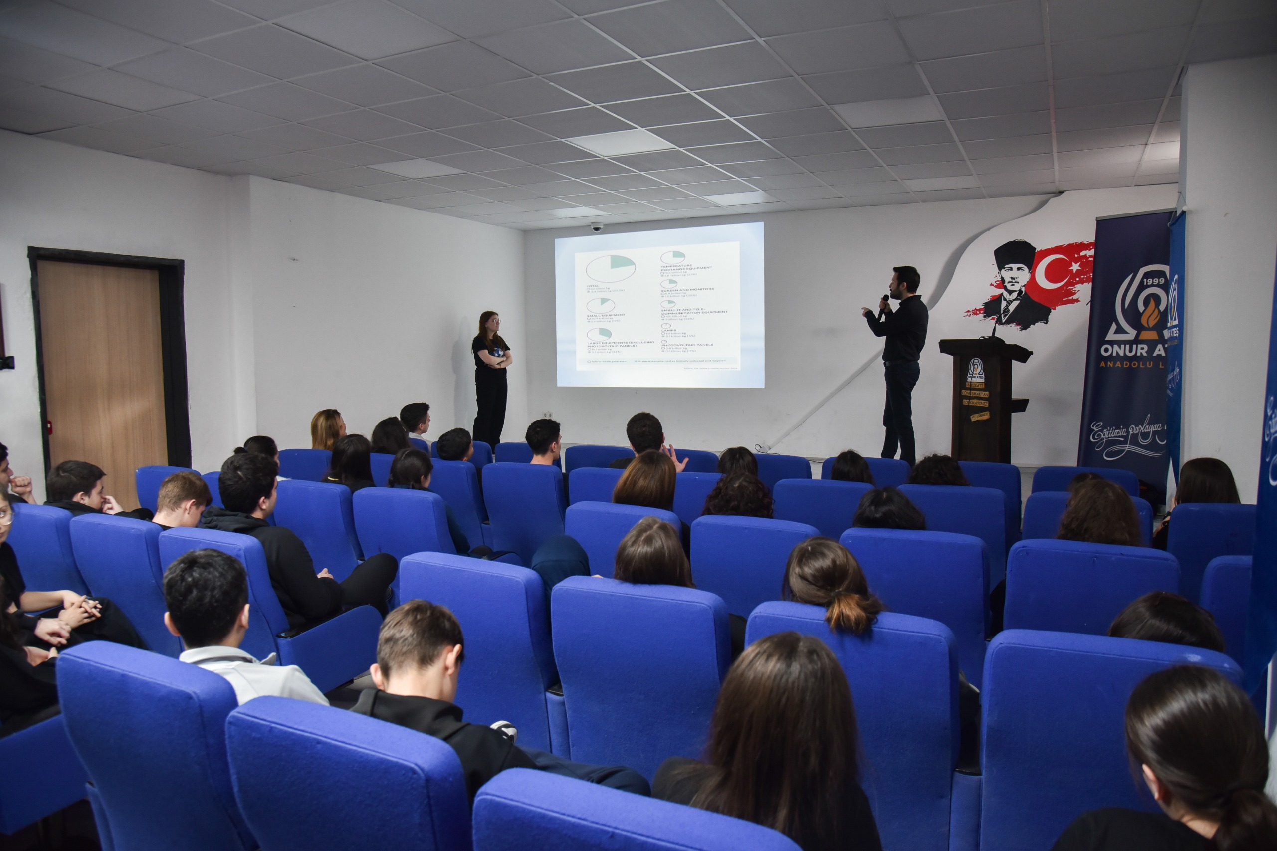 Onur Ateş Anadolu Lisesi’nde düzenlenen seminerde Atakum Belediyesi İklim Değişikliği ve Sıfır Atık Müdürlüğünden Mithat Dikmen öğrencilere elektronik atıkların çevreye etkilerini, doğru ayrıştırma ve geri dönüşüme kazandırılma sürecini kapsamlı olarak anlattı. Dikmen, “Elektronik atık, kullanım ömrünü tamamlamış artık kullanılmayan cihazlar demek oluyor. Aydınlatma ürünlerini biliyorsunuz, sensörlü lambalar var artık. Takıldı, sistemler kurulmaya başladı. Bunların hepsi elektronik içeriyor. Küçük ev aletleri, ısı kontrollerini sağlayan aletler, elektronik atıktır. Kurşun, civa gibi ağır metaller içerir. Doğa ve insan sağlığına ciddi zararlara neden olur.” cümlelerini kaydetti.