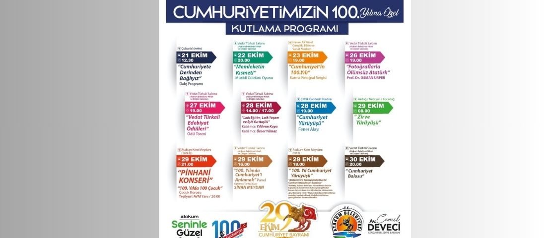 Saat 16.00’da başlayacak panelde Cumhuriyet’in kuruluşundan bugüne tarihe yön veren olaylar, masaya yatırılıyor. Cumhuriyet sevdalıları saat 18.00’da Cumhuriyet Kadınları Bandosu eşliğinde başlayacak ‘100. Yıl Cumhuriyet Yürüyüşü’ ile Atakum Belediyesi’nden Atakum Kent Meydanı’na kadar olan mesafeyi marşlar eşliğinde yürüyecek. Araç konvoyu saat 16.00’da Atakum Belediyesi hizmet binası önünden hareket ederek Abdullah Gül Bulvarı güzergahını takip edecek. Vatandaşları, Kent Meydanı’nda ünlü müzik grubu Pinhani’nin konseri bekliyor. Saat 21.00’da başlayacak konserde, Atakum Belediyesi’nin Çocuk Korosu da ‘100. Yılda 100 Çocuk’ sloganıyla sahne alacak. Atatürkçü Düşünce Derneği (ADD) ile düzenlenen geleneksel ‘Cumhuriyet Balosu’, Vedat Türkali Salonu’nda 30 Ekim Pazartesi günü saat 20.00’da başlayacak.