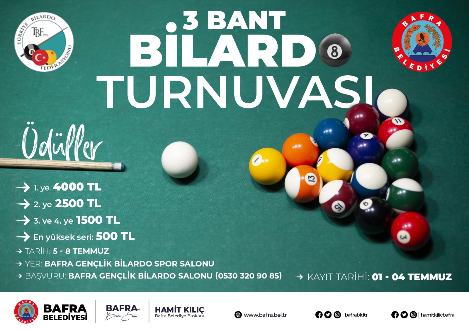 Başvuruların 4 Temmuz Pazar günü sona ereceği turnuvanın katıtları Bafra Gençlik Bilardo salonunda kabul ediliyor.