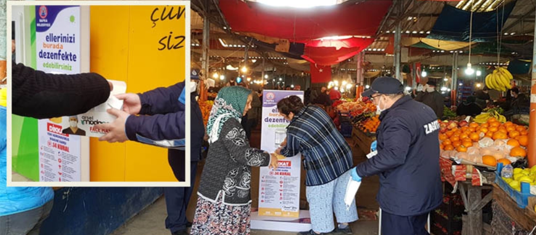Korona virüs tedbirleri kapsamında pazar yerleri ile ilgili alınan kararlar doğrusunda hareket eden Bafra Belediyesi, söz konusu alanlara dezenfektan aparatları yerleştirdi