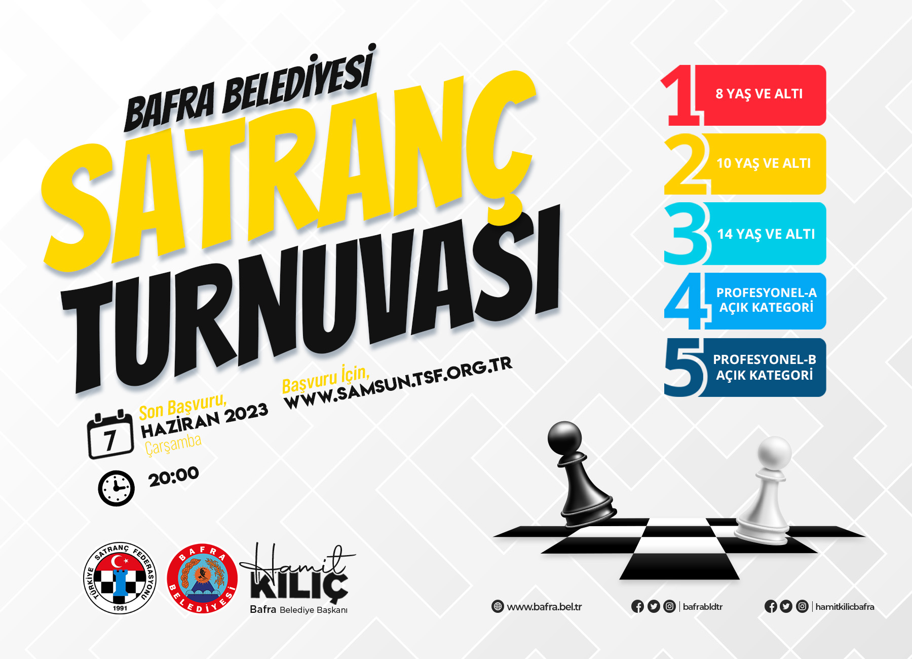 Bafra Belediyesi ev sahipliğinde; Türkiye Satranç Federasyonu’nun koordinasyonunda, Samsun Satranç İl Temsilciliği ve Bafra Satranç İlçe Temsilciliği desteği ile yapılacak Satranç Turnuvası’nın başvuruları devam ediyor.