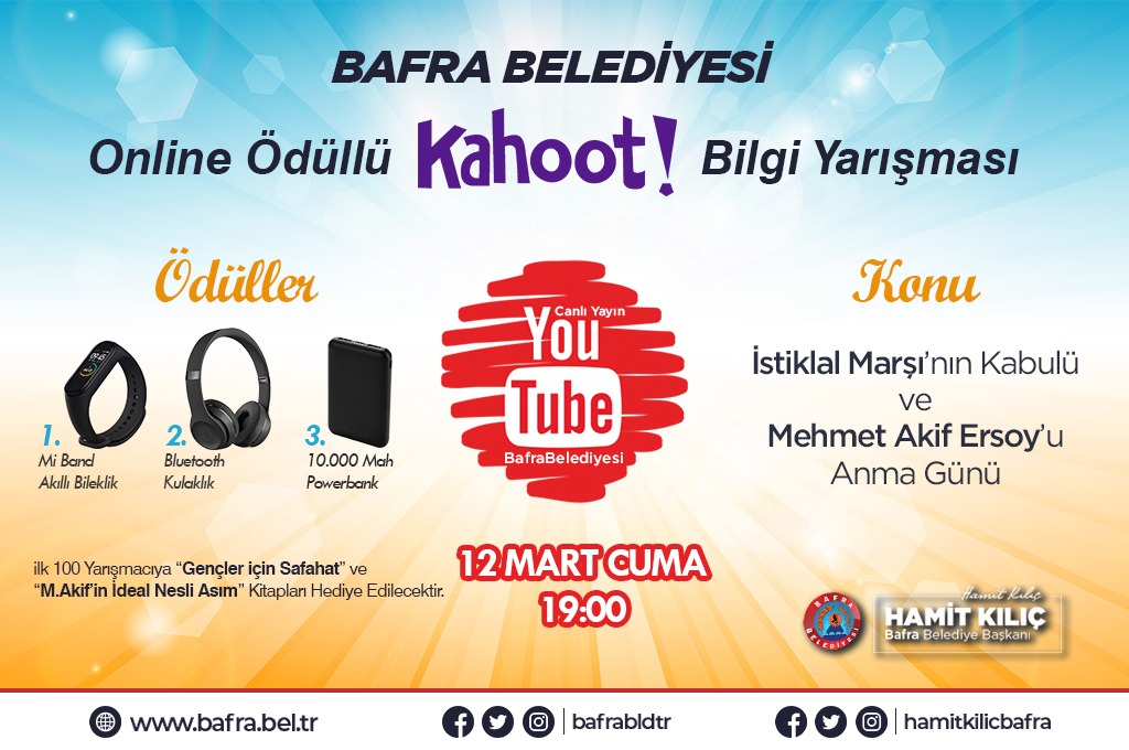 Yaş sınırının olmadığı bilgi yarışmasında katılımcılar, Bafra Belediyesi Youtube kanalından yayınlanan pin kodunu, kahoot.it sitesinde veya uygulamasındaki ilgili alana girdiklerinde karşılarına çıkacak ‘Nickname’ bölümüne ad ve soyadlarını yazarak yarışmaya doğrudan katılabilecek.