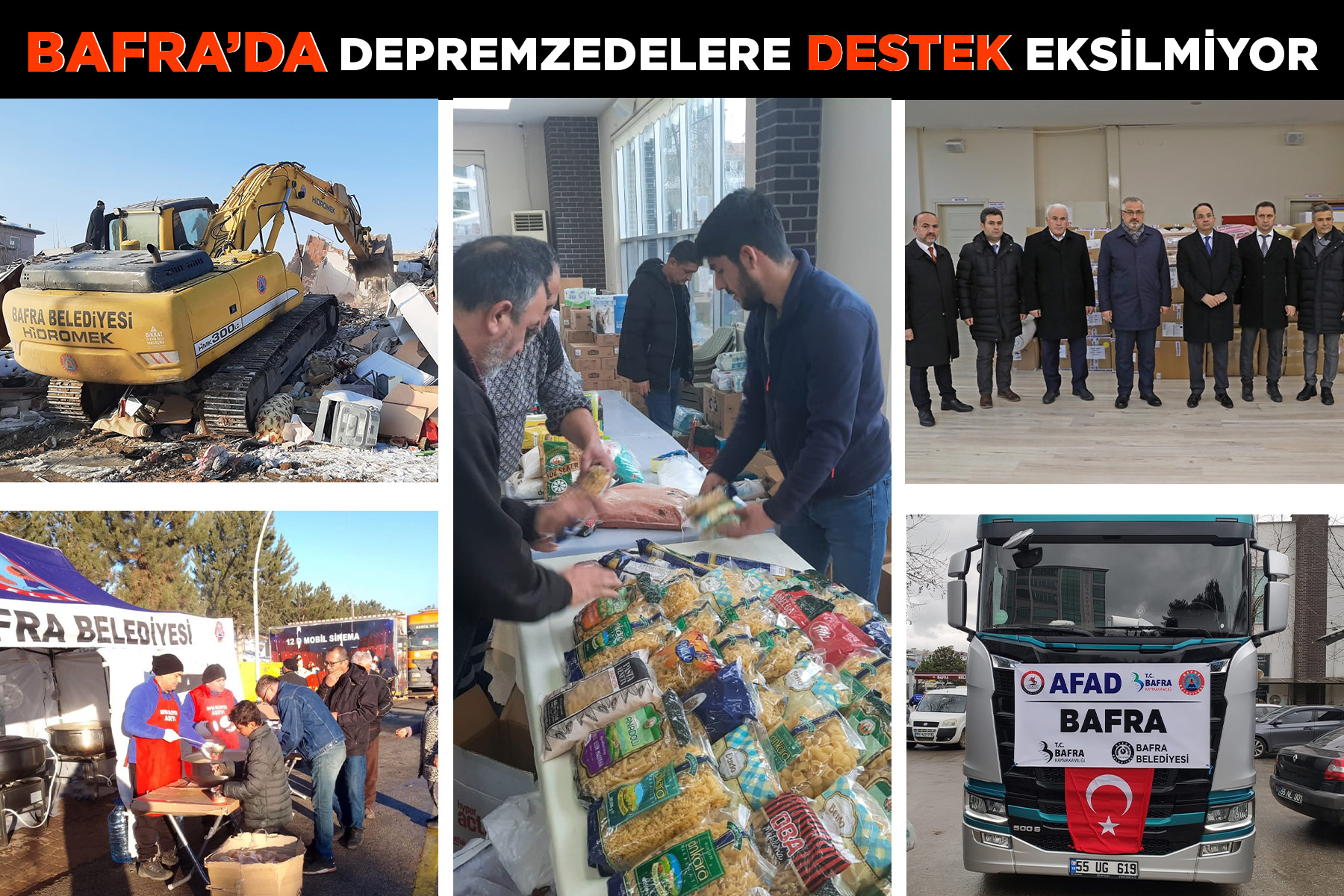 Meydana gelen deprem felaketinin ardından harekete geçen Bafra Kaymakamı Cevdet Ertürkmen ve Bafra Belediye Başkanı Hamit Kılıç, depremin ilk gününden itibaren Bafra’dan bölgeye gidecek olan yardımları koordine ederek, içlerinde başta gıda, giysi ve barınma olmak üzere çok çeşitlilikteki yardım malzemeleri bulunan 35 adet tırı AFAD aracılığı ile bölgeye ulaştırdı. Ayrıca Bafra Belediyesi Elbistan’da kurduğu aşevi ile günlük bin depremzedenin sıcak yemek ihtiyacını karşılamanın yanında personel desteği, iş makinaları, temizlik ve cenaze araçlarını da bölgede görevlendirdi.