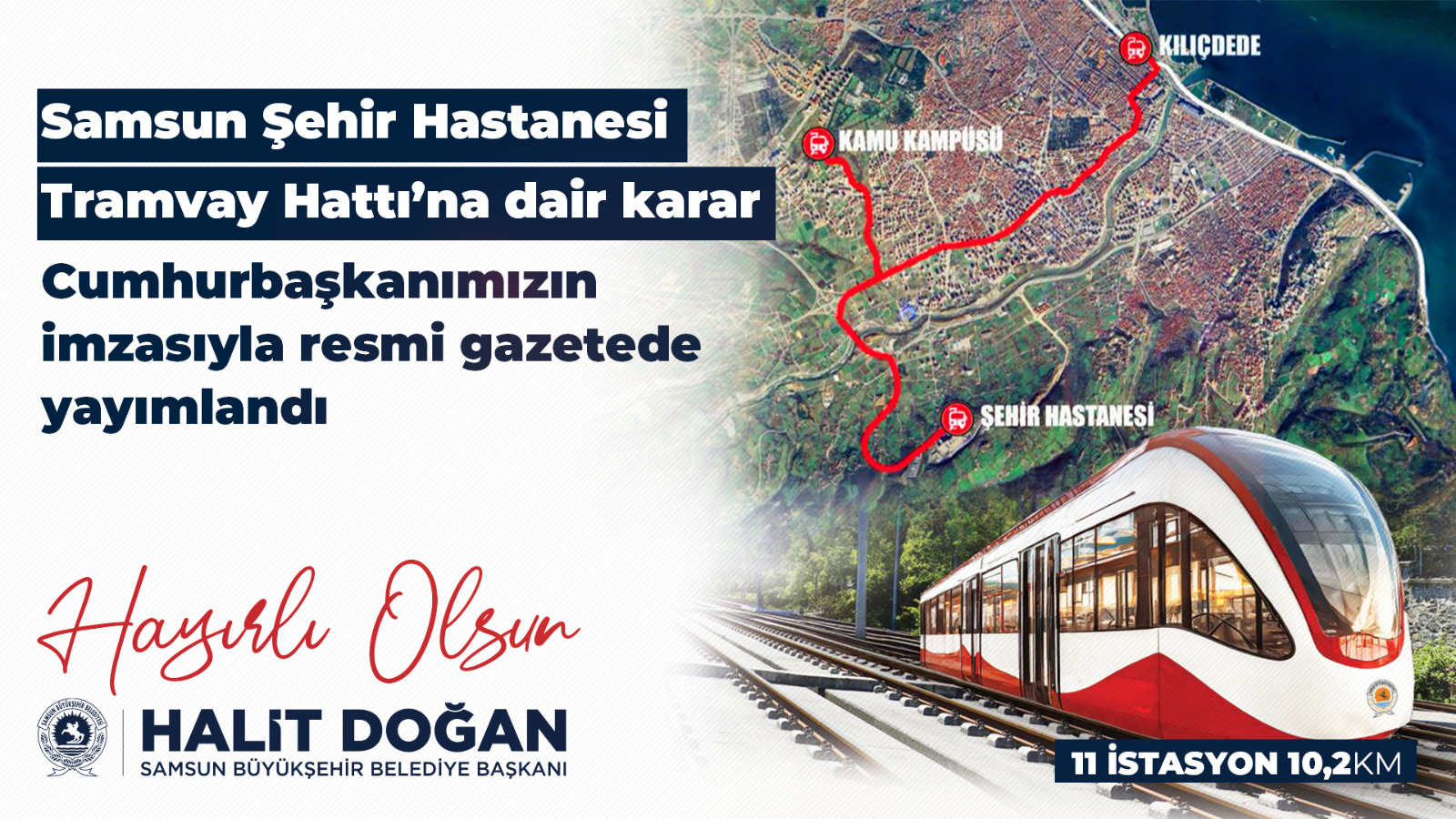Samsun Büyükşehir Belediye Başkanı Halit Doğan’ın seçim vaatleri arasında da yer alan, Samsun’daki ulaşım hızı ve konforunu büyük ölçüde etkileyecek Şehir Hastanesi Tramvay Hattı’nın yapımının Ulaştırma ve Altyapı Bakanlığı tarafından üstlenilmesine dair müjde niteliğinde karar Cumhurbaşkanı imzasıyla 31 Ağustos tarihli resmi gazetede yayımlandı. Başkan Halit Doğan, “Daha hızlı, daha güvenli, daha konforlu ulaşım için çalışmaya devam ediyoruz” diyerek bu müjdeli haberi duyurdu.