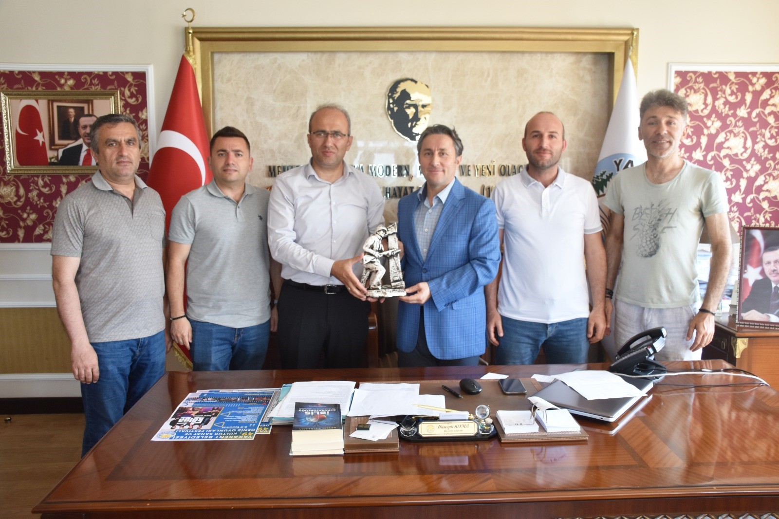 Yakakent Belediye Başkanı Hüseyin Kıyma, “Geleceğimizin teminatı olan öğrencilerimize Çanakkale ruhunu yaşatmanın onurunu ve gururunu yaşıyorum ”dedi.Yakakent Belediyesi tarafından her yıl düzenlenen ve bu yıl 6’ıncsı gerçekleşen İstanbul ve Çanakkale gezisi nin ardından, İlçe Milli Eğitim Müdürü Adem Şimşek, 100’ Yıl Ortaokulu Müdürü Fatih Özcan, İmam Hatip Ortaokulu Müdürü İlker Öksüz, Karaaba Şehit Bayram Aksu Ortaokulu Müdürü Servet Altundaş ve Kozköy Ortaokulu Müdürü Abdülkerim Açıkgöz, Yakakent Belediye Başkanı Hüseyin Kıyma’ya teşekkür ziyaretinde bulundular.‘KURTULUŞ SAVAŞI YILLARINI TASAVVUR ETTİLER’Öğrencilerin büyük bir sevinç ve heyecanla iştirak ettiği geziden duydukları memnuniyeti dile getiren İlçe Milli Eğitim Müdürü Adem Şimşek, “geziye katılan öğrencilerimizin önemli bir bölümü bu gezi sayesinde ilk kez Çanakkale’yi görme şansına kavuştu. Heyecan ve mutlulukları gözlerinden okunan çocuklarımız Çanakkale ruhunu yerinde yaşayarak Kurtuluş Savaşı yıllarını tasavvur ettiler. Milli birlik ve bütünlüğümüzün pekiştiği bu ziyaretler için başta Belediye Başkanımız Sayın Hüseyin Kıyma olmak üzere emeği geçen herkese çocuklarımız adına teşekkür ediyorum” diye konuştu.‘ELİMİZDEN GELEN GAYRETİ GÖSTERİYORUZ’Güzel düşüncelerinden ve katkılarından dolayı İlçe Milli Müdürü Adem Şimşek’e ve okul müdürlerine teşekkürlerini sunan Yakakent Belediye Başkanı Hüseyin Kıyma “Yakakent Belediyesi olarak vatan sevgisi, millet ve bayrak bilincini geleceğin teminatı olan çocuklarımıza ve gençlerimize aktarmak için elimizden gelen gayreti gösteriyoruz. Bu çerçevede bir farkındalık oluşturarak gençlerimize tarih bilincini kazandırmak ve vatan sevgisini artırmak için ecdadımızın göstermiş olduğu fedakarlıkları yaşatmak istedik. Çanakkale projesi çerçevesinde geleceğimizin teminatı gençlerimiz atalarının tarih yazdığı topraklarda yedi düvele karşı verdiği mücadelenin hangi zor şartlarda olduğunu yerinde öğreniyorlar. Destanlarımızın ve tarihimizin, gelecek kuşaklara aktarılmasında böyle çalışmaların önemli olduğuna inanıyoruz” ifadelerini kullandı.Ziyarette İlçe Milli Eğitim Müdürü Adem Şimşek ve Okul Müdürleri, Yakakent Belediye Başkanı Hüseyin Kıyma ’ya Çanakkale’den getirilen asker heykeli takdim ettiler.Köksal ÖNER