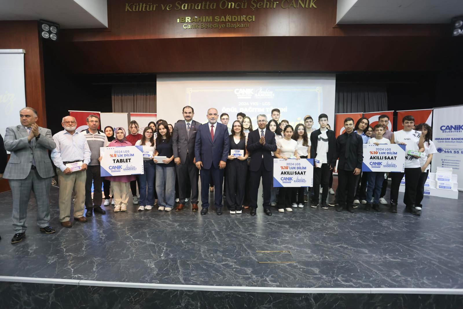 Canik Belediyesi YKS-LGS Ödül Töreni’nde Canik’te okuyup 2024 YKS’de ilk 500’e giren öğrencilere dizüstü bilgisayar, 5 bine giren öğrencilere cep telefonu, 50 bine giren öğrencilere tablet ödülü verilirken, 2024 LGS’de ise Canik’te okuyan ve yüzde 1’lik dilime giren öğrencilere tablet ile gram altın, yüzde 5’lik dilime giren öğrencilere tablet, yüzde 10’luk dilime giren öğrencilere ise akıllı saat hediye edildi.