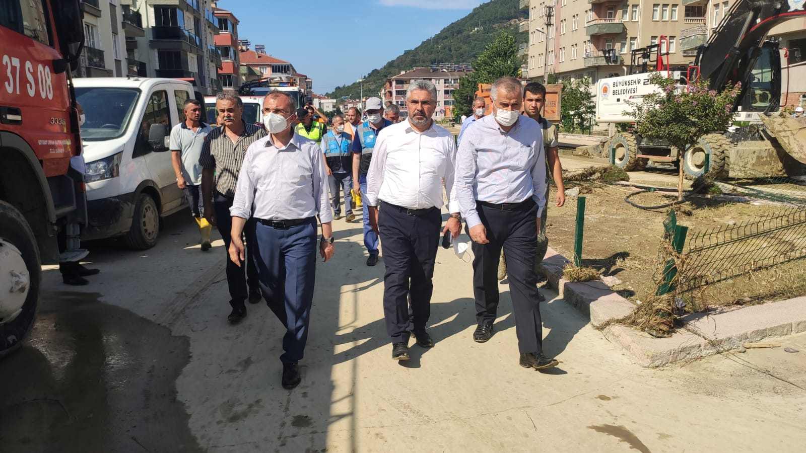 Bafra Belediye Başkanı Hamit Kılıç, yaşanan selin ardından devam eden çalışmalara destek olmak amacıyla ekibiyle birlikte Ayancık ilçesinde.