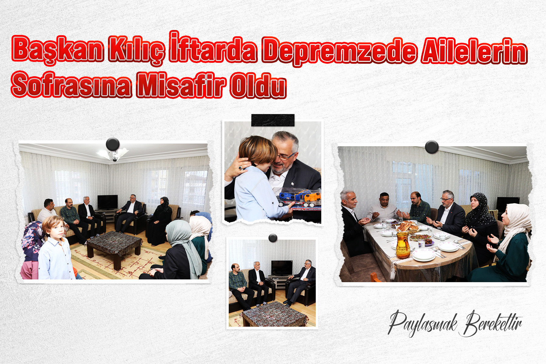 İftar öncesi aile üyeleriyle ayrı ayrı sohbet etmeyi ihmal etmeyen Başkan Kılıç, ailelere geçmiş olsun dileklerini ileterek iftar davetinde şu sözleri kullandı: “Ülke olarak bizleri derinden yaralayan asrın felaketi ile karşı karşıya kaldık. Milletçe yaralarımızı sarmak için çalıştığımız günlerde Ramazan-ı Şerif’in maneviyatı içerisinde dostluk ve kardeşlik duygularımızı geliştirmeye gayret ediyoruz. Bizler sadece bugün değil her gün depremzede kardeşlerimizin yanındayız. İlçemize Malatya deprem bölgemizden gelen ailelerimizle birlikte aynı sofrada buluşmanın huzurunu yaşıyor, bizleri aynı sofrada buluşturan Yüce Rabbime hamd ediyorum. Rabbim birliğimizi baki, tuttuğumuz oruçları kabul ve makbul eylesin” dedi.