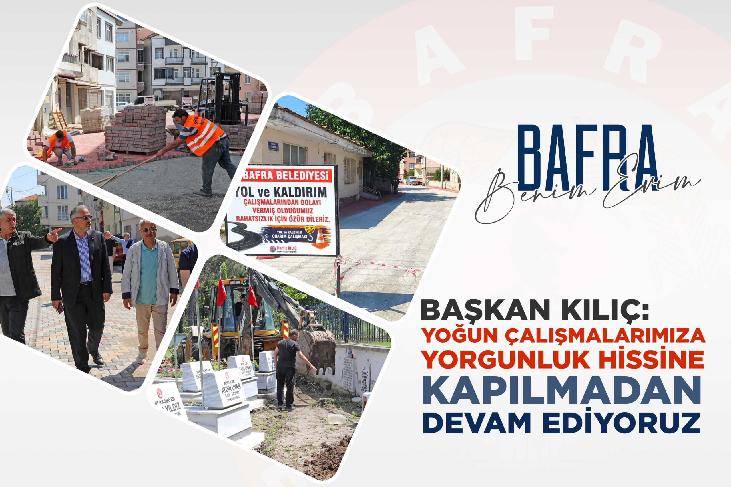 “Mevsim itibariyle ekiplerimiz Bafra’mızın her noktasında çalışmalarını hızlandırdı. Mezarlık bünyesinde yer alan Şehitliğimizde düzenleme çalışmalarımız tüm hızıyla devam ediyor. Söz konusu alandaki çalışmalarımız kısa süre içerinde tamamlanacak. Fen İşleri Müdürlüğümüzde aynı zamanda Samsun Büyükşehir Belediyemiz Su ve Kanalizasyon İdaresi Genel Müdürlüğü koordinasyonunda hızlı bir seyirle ilerleyen son 50 yılın en kapsamlı altyapı çalışmalarının tamamlandığı cadde ve sokaklarda parke ve beton yol çalışmalarını sürdürüyor.