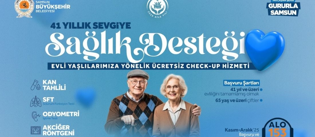 Samsun Büyükşehir Belediyesi, yaşlı vatandaşların sağlıklı ve kaliteli bir yaşam sürmelerine katkı sağlamak amacıyla anlamlı bir projeyi hayata geçiriyor. “Aile Yılı” kapsamında başlatılan uygulama sayesinde uzun yıllardır birlikteliğini sürdüren büyükler için ücretsiz check-up hizmeti sunulacak. Büyükşehir Belediyesi bu hizmetle uzun yıllardır birlikteliğini sürdüren büyüklerin sağlıklı yaş almalarını desteklemek, evliliği devam ettirmenin önemini vurgulayarak farkındalık oluşturmak ve yaşlanma sürecinde karşılaşabilecekleri sağlık risklerini erken teşhis etmeyi amaçlıyor.Samsun Büyükşehir Belediyesi’nin öncülüğünde yürütülecek ücretsiz sağlık taramasında; kan tahlilleri, solunum fonksiyon testi (SFT), odyometri (işitme testi), akciğer röntgeni ve elektrokardiyografi (EKG) hizmetleri verilecek.