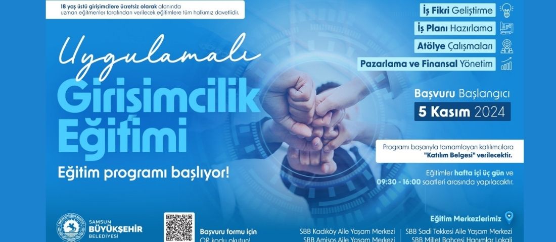 Her alanda vatandaşların yanında olan ve düzenlediği eğitim programları ile hem akademik yaşamı hem de sosyal yaşamı destekleyen Samsun Büyükşehir Belediyesi, “Uygulamalı Girişimcilik Eğitimi” programlarına başlıyor. 5 Kasım Salı günü itibariyle başvuruları başlayan Girişimcilik Eğitimlerine; 18 yaş üstü tüm vatandaşlar katılım sağlayabiliyor.