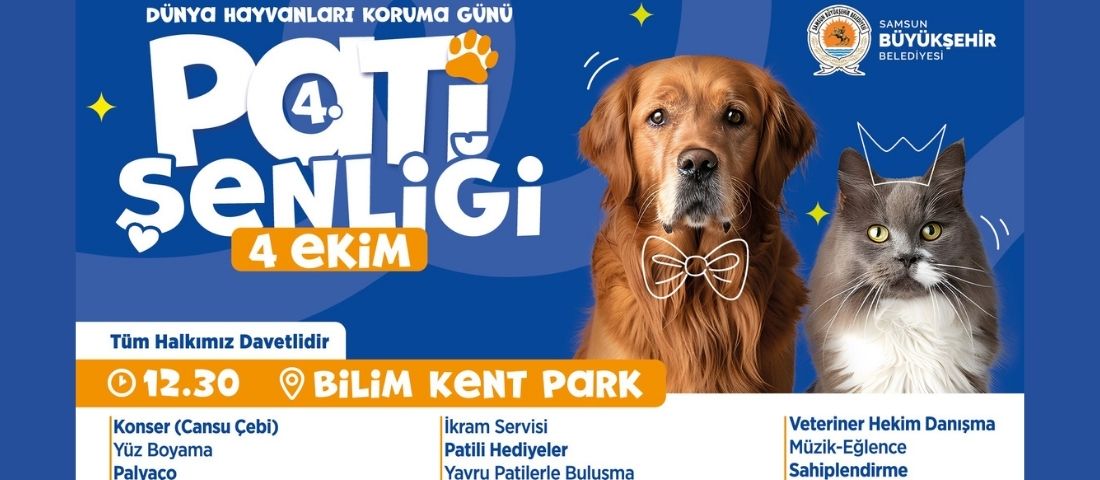 Samsun Büyükşehir Belediyesi, 4 Ekim Dünya Hayvanları Koruma Günü’nde, Kent Park’ta “Pati Şenliği” düzenliyor. Hayvanları Koruma Günü’ne özel düzenlenecek program ile hayvanseverler ve can dostları bir araya getirecek. Pati Şenliğinde; veteriner hekim danışma hizmetinden sahiplendirmeye, konserden çeşitli eğlencelere birçok etkinlik vatandaşlarla buluşacak.