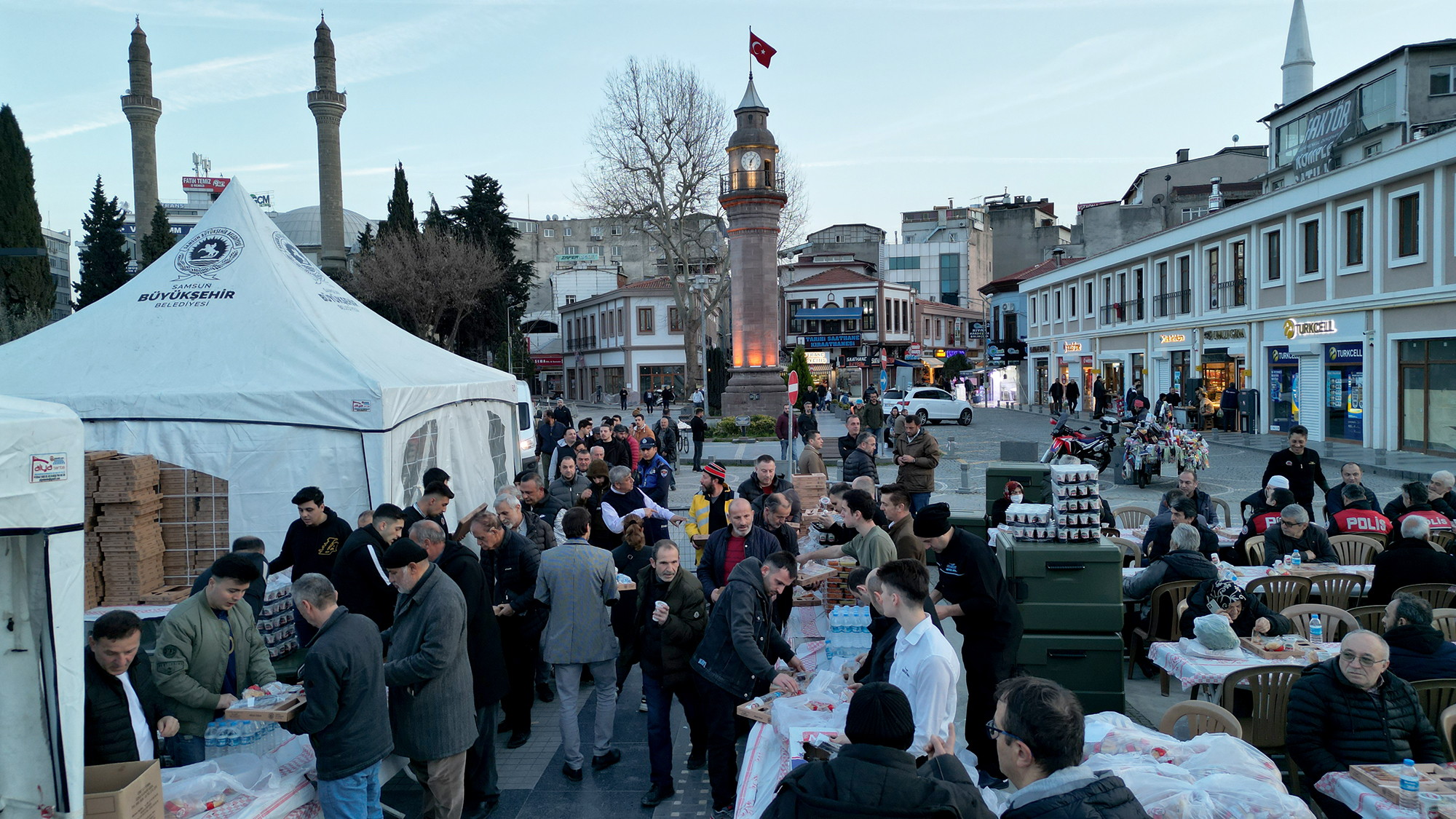 Samsun Büyükşehir Belediyesi tarafından tarihi Saathane Meydanı’nda Ramazan Ayı süresince her gün vatandaşlar için iftar sofraları kuruluyor. Samsunlular beraber iftar yaparak Ramazan Ayı’nın bereketini birlikte paylaşıyor.Samsun Büyükşehir Belediyesi tarafından vatandaşların Ramazan Ayı’nın iklimini birada yaşamalarını sağlamak için tarihi Saathane Meydanı’nda iftar çadırları kuruldu. Ramazan Ayı’nın başlamasıyla birlikte kurulan iftar sofralarında her gün yaklaşık 2 bin kişi birlikte oruçlarını açıyor.‘HER GÜN YAKLAŞIK 2 BİN VATANDAŞLARIMIZLA BİRLİKTE BİR ARADA İFTAR YAPIYORUZ’İftar programının Ramazan ayı sonuna kadar devam edeceğini belirten Büyükşehir Belediyesi Kültür ve Sosyal İşler Dairesi Başkanı İdris Akdin, “Tarihi Saathane Meydanı’nda Ramazan Ayı’nın bereketini Samsunlu vatandaşlarımızla paylaşıyoruz. Her gün yaklaşık 2 bin vatandaşlarımızla birlikte bir arada iftar yapıyoruz. Bütün vatandaşlarımızı Ramazan Ayı’nın bereketini burada bizimle paylaşmaya davet ediyoruz. Ramazan ayı süresince her gün iftar vaktinde Saathane Meydanı’nda vatandaşlarımızla birlikte olacağız inşallah.” diye konuştu.Köksal ÖNER