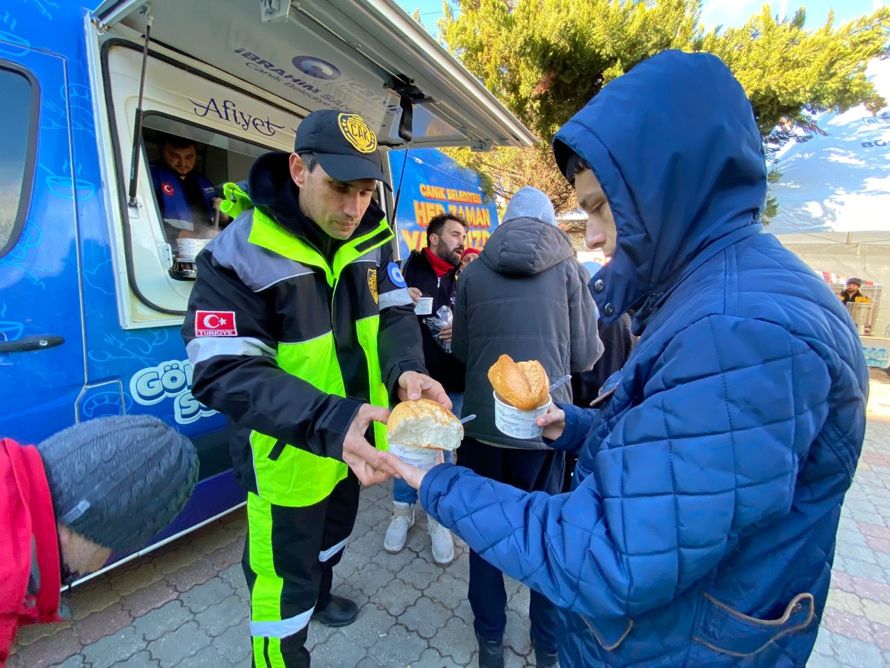 Canik Belediyesi tarafından deprem bölgesine gönderilen sıcak yemek aracı depremden etkilenen vatandaşlara sıcak yiyecek ve içecek ikramında bulunmaya devam ediyor. Sıcak yemek aracında hazırlanan yiyecek ve içecekler görevliler eşliğinde vatandaşlara ve arama kurtarma ekiplerine ikram ediliyor.