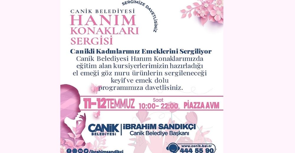 Canik Belediyesi’nin ilçedeki kadınlara yönelik sertifikalı mesleki eğitimler düzenleyerek onların istihdamına katkı sağladığı, ilçedeki kadınlara özel olarak seminerler, kültür ve sanat faaliyetleri düzenlediği Canik Belediyesi Hanım Konakları’nda eğitim alan kursiyerler, eğitimler kapsamında binbir emekle hazırladıkları ürünleri sergileyecek. Birbirinden güzel ürünlerin görücüye çıkacağı Canik Belediyesi Hanım Konakları Sergisi, 11-12 Temmuz tarihlerinde, saat 10.00 – 22.00 arasında Piazza Avm’de ziyaretçilerini ağırlayacak.