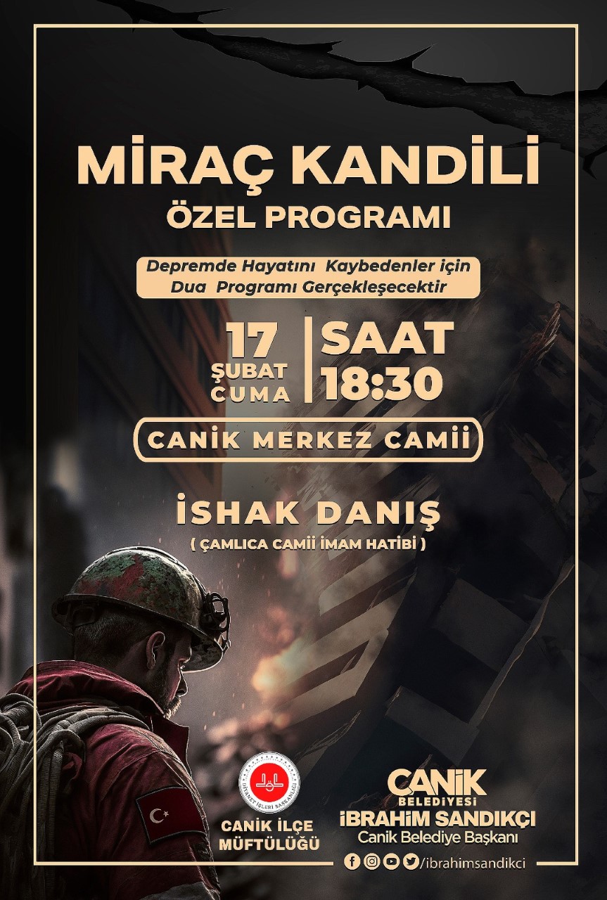Canik Belediyesi ilçede ‘Miraç Kandili Özel Programı’ düzenliyor. Büyük Çamlıca Camii İmam Hatibi İshak Danış’ın katılacağı programda, depremlerde hayatını kaybeden vatandaşlar için dua edilecek.Canik Belediyesi’nin ilçede düzenleyeceği Miraç Kandili Özel Programı’nda bir araya gelecek olan binlerce vatandaş, Kahramanmaraş merkezli depremlerde hayatını kaybeden vatandaşlar için dua edecek. Büyük Çamlıca Camii İmam Hatibi İshak Danış’ın ve Canik İlçe Müftülüğü imam hatiplerinin Kuran’ı Kerim tilavetinde bulunacağı, Mevlid-i Şerif’in seslendirileceği ve depremlerde hayatını kaybeden vatandaşlar için dualar edileceği ‘Miraç Kandili Özel Programı’ 17 Şubat 2023 tarihinde saat 18.30’da Canik Merkez Camii’nde gerçekleşecek. CANİK’TE MİRAÇ KANDİLİ DUALARLA İDRAK EDİLECEKCanik Belediyesi ve Canik İlçe Müftülüğü işbirliğiyle düzenlenecek Miraç Kandili Özel Programı’nda binlerce vatandaş Canik Merkez Camii’nde bir araya gelecek. Programda Kahramanmaraş merkezli depremlerde hayatını kaybeden vatandaşlar, depremzedeler ve deprem bölgesinde çalışmalara devam eden ekipler için dualar edilecek. Programda Kuran-ı Kerim tilavetinde bulunacak olan Büyük Çamlıca Camii İmam Hatibi İshak Danış ve Canik İlçe Müftülüğü imam hatipleri, Mevlid-i Şerif seslendirecek. Miraç Kandili’nin dualarla idrak edileceği programda, Canik Belediyesi vatandaşlara ikramlarda bulanacak.Köksal ÖNER