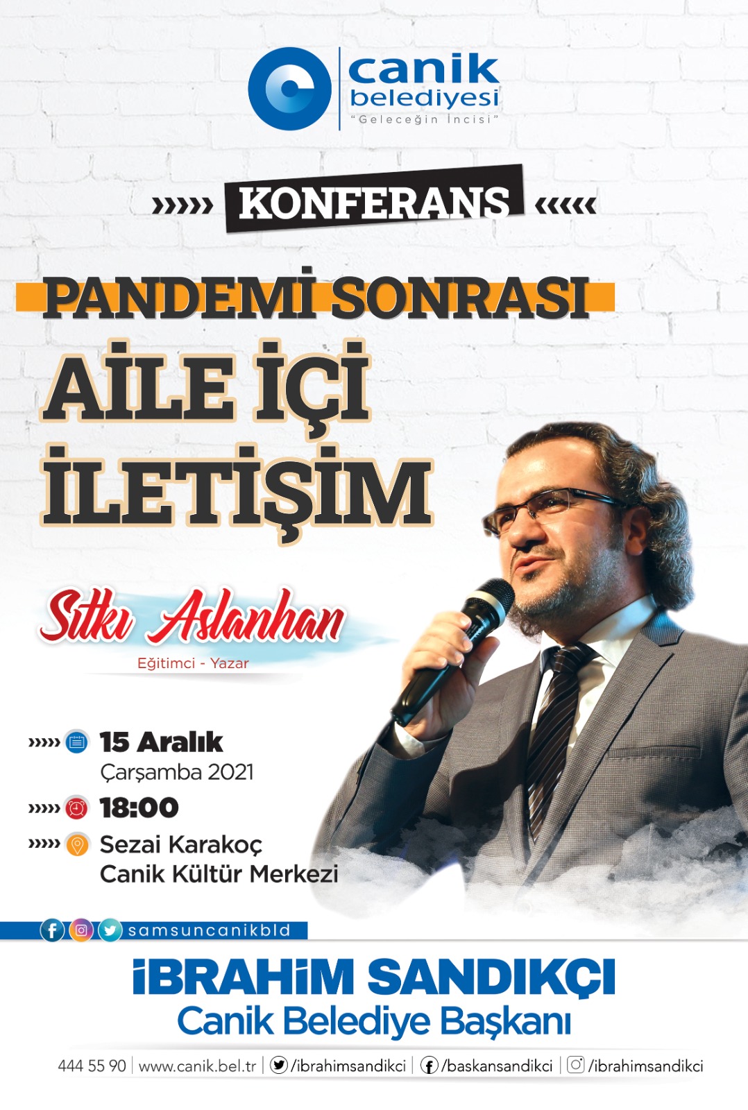 Canik Belediyesi, “Pandemi Sonrası Aile İçi İletişim” başlığıyla seminer vermek üzere Eğitimci-Yazar Sıtkı Aslanhan’ı ağırlıyor.