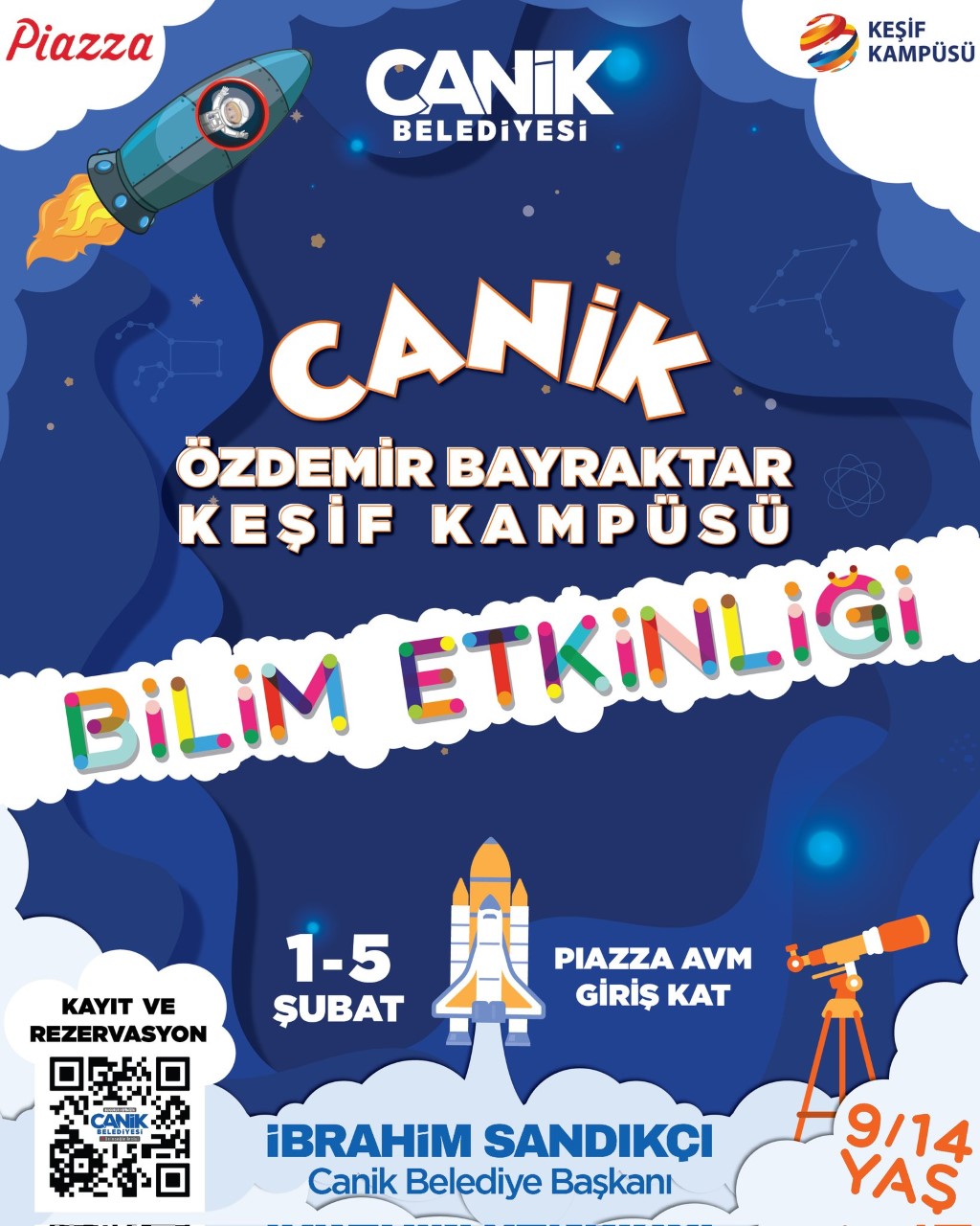 Canik Belediyesi tarafından ilçede düzenlenecek ‘Canik Özdemir Bayraktar Keşif Kampüsü Bilim Etkinliği’ ile çocuklar bilim ve teknolojiyle bir araya geliyor. Etkinlikte yeni nesil teknolojileri yakından inceleyecek olan çocuklar, özel olarak oluşturulan uygulama alanlarında çalışmalar gerçekleştirecek. Çocukların kendini keşfedeceği, eğlenirken öğreneceği etkinlikte, model roket tasarımı, uçak simülasyonu, ödüllü bilgi yarışmaları ve daha birçok eğitici, eğlenceli aktivite gerçekleşecek. Canik Özdemir Bayraktar Keşif Kampüsü Bilim Etkinliği, 1-5 Şubat 2023 tarihleri arasında Piazza AVM etkinlik alanında gerçekleşecek.