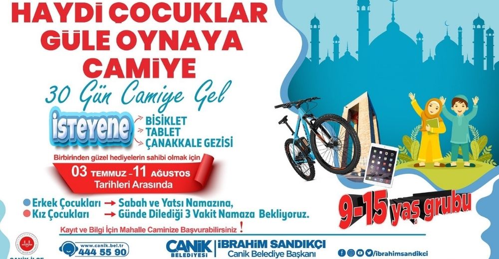 Canik Belediyesi, geçtiğimiz yıl çocukların yoğun katılım göstererek ilçedeki camilere sevinç ve neşe içerisinde akın ettiği ‘Haydi Çocuklar Güle Oynaya Camiye’ projesinin bu yıl ikincisini düzenliyor. Canik Belediyesi ve Canik İlçe Müftülüğü iş birliğiyle ilçede düzenlenen proje kapsamında Canik’te 40 gün boyunca camiye giden çocuklar ‘Çanakkale gezisi’, ‘tablet’ ve ‘bisiklet’ hediyelerinin sahibi olacak.