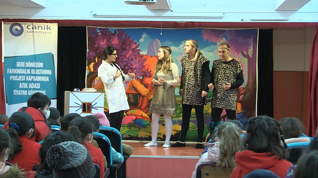 Kültür ve sanat faaliyetlerine hız kesmeden devam eden Canik Belediyesi, yürüttüğü çevre projesi kapsamında ilçedeki ilkokullardasergilenen tiyatro oyunları ile öğrencilere çevre bilinci kazandırıyor