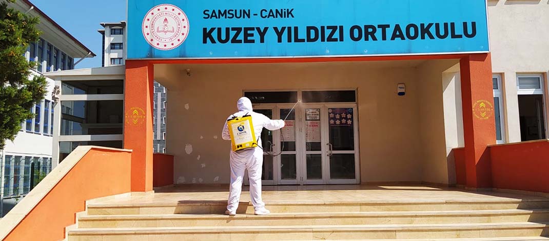 Koronavirüs ile mücadelesini her alanda sürdüren Canik Belediyesi, İlçe Milli Eğitim Müdürlüğü’nün belirlediği okullarda okul bahçelerini, bina giriş kapılarını, sınıf kapı kollarını, masaları ve sıraları, sınıfları, koridorları ve lavaboları tek tek steril hale getirerek dezenfekte etti. Okul girişlerine ve sınıflara el dezenfektanı ve maske yerleştirilerek sosyal mesafe kuralına uyulması açısından da yerlere uyarı işaretleri yapıştırıldı.