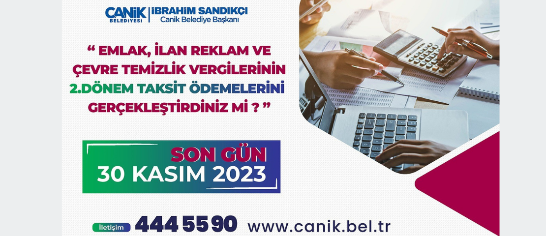 Canik Belediyesi, emlak, çevre temizlik, ilan ve reklam vergilerinin ikinci taksit ödemelerinin son günü 30 Kasım 2023 olduğunu hatırlatarak mükelleflere çağrıda bulundu. Canik Belediyesi Mali Hizmetler Müdürlüğü tarafından yapılan yazılı açıklamada, “ 2023 yılı emlak, çevre temizlik, ilan ve reklam vergilerinin ikinci taksit ödemeleri 30 Kasım 2023 Perşembe günü mesai bitiminde son bulacaktır” ifadelerine yer verildi.