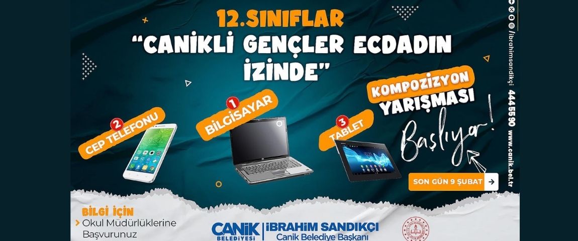 Cumhuriyetin 100. yılında öğrencileri şehitler diyarı Çanakkale ile buluşturan Canik Belediyesi, düzenlediği Çanakkale ve milli mücadele temalı kompozisyon yarışmasıyla öğrencileri ödüllerle buluşturuyor. Canik’te öğrencilerin, Çanakkale savaşları, milli mücadele dönemi ve Çanakkale Şehitlikleri’ni konularını kaleme alacağı ‘Canikli Gençler Ecdadın İzinde Kompozisyon Yarışması’ başvuruları 9 Şubat 2024 tarihine kadar devam edecek. Jüri değerlendirmelerinin ardından sonuçların açıklanacağı yarışmada, birinciye bilgisayar, ikinciye cep telefonu, üçüncüye tablet ödülü verilecek.