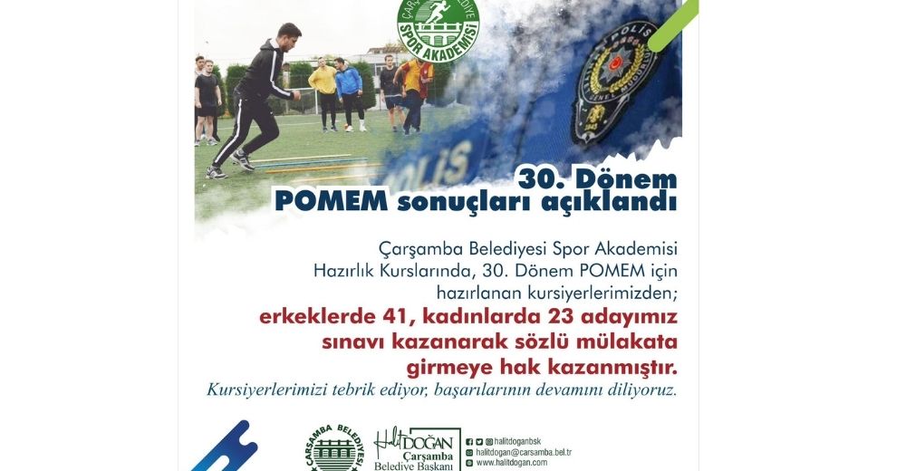 Çarşamba Belediyesi eğitimden kültüre, sanata her alanda gençleri desteklemeye devam ediyor. Çarşamba Belediyesi tarafından, polis olma hayaliyle çalışan gençler için ücretsiz olarak açılan Spor Akademisi Hazırlık Kurslarında, 30. Dönem Polis Meslek Eğitim Merkezi (POMEM) için hazırlanan kursiyerlerden; kadınlarda 23, erkeklerde 41 kişi spor mülakatını başarıyla tamamladı. Çarşamba Belediye Başkanı Halit Doğan kursiyerleri tebrik ederek başarılarının devamını diledi. Başkan Doğan, “Biz, gençlerin her zaman yanındayız. Bugünümüz de geleceğimiz de onlara emanet” dedi.