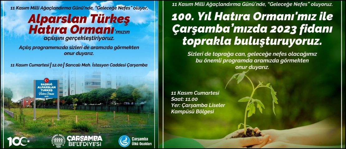 Çarşamba’da, 11 Kasım Milli Ağaçlandırma Günü’nde 100. Yıl Hatıra Ormanı ile “Geleceğe Nefes” olunuyor, 2023 fidan toprakla buluşuyor. Milli Ağaçlandırma Günü’nde Alparslan Türkeş Hatıra Ormanı’nın da açılışı gerçekleşiyor.