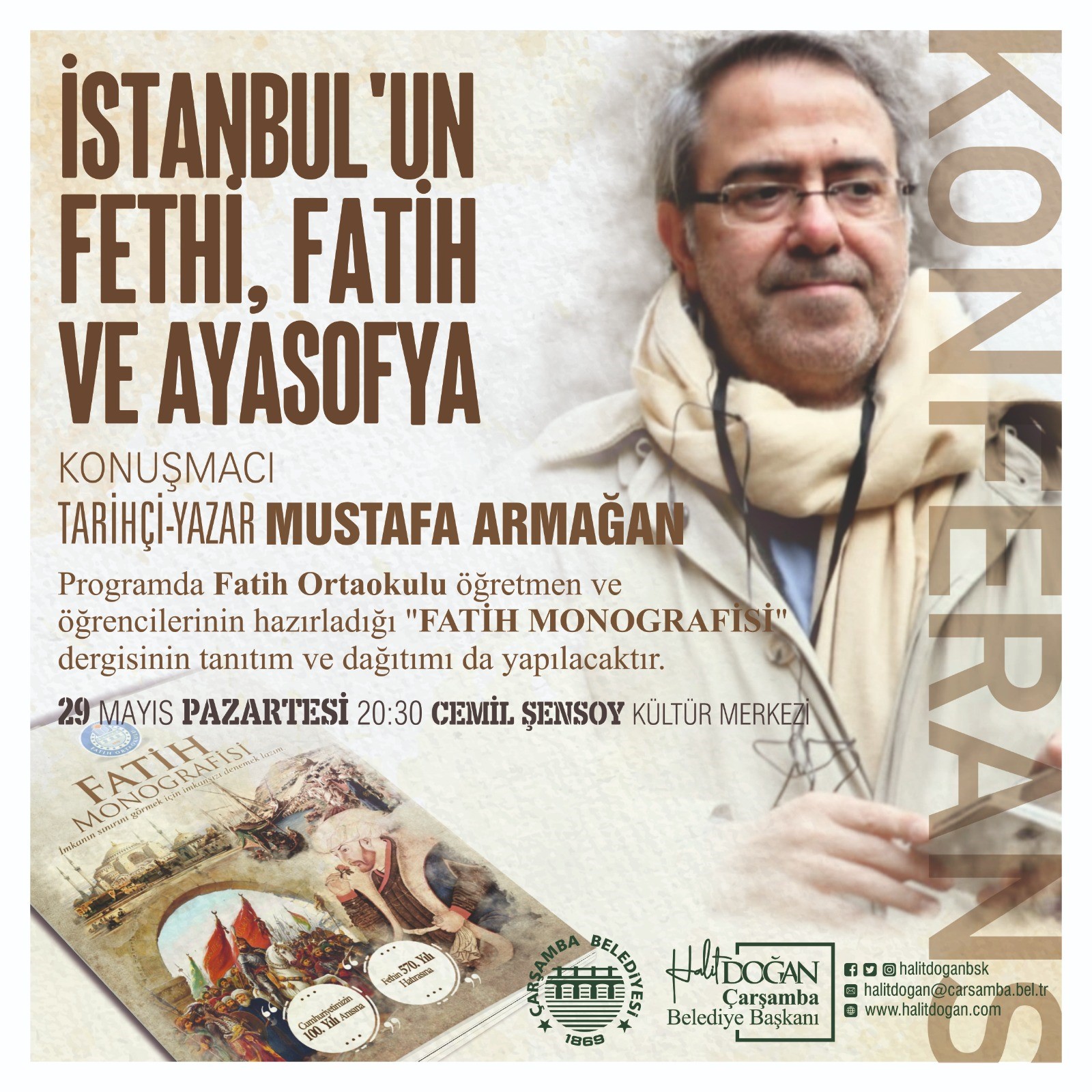 Çarşamba Belediyesi, İstanbul’un Fethi’nin 570. yıl dönümünde Tarihçi-Yazar Mustafa Armağan’ın konuşmacı olarak katılacağı, “İstanbul’un Fethi, Fatih ve Ayasofya” adlı program ile vatandaşlarla buluşuyor.