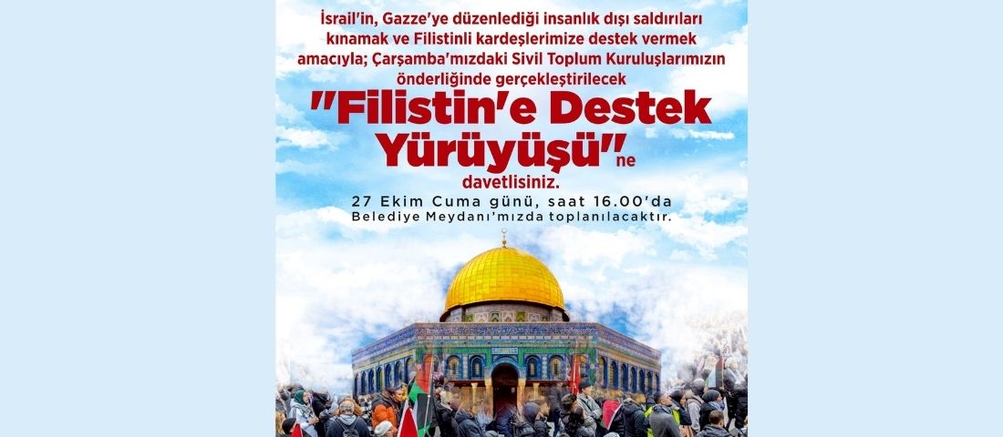 Çarşambalılar, Gazze’ye yapılan saldırılara karşı, Filistin halkının yanında olduğunu göstermek ve yapılan saldırıları kınamak için yürüyor. Çarşamba’daki sivil toplum kuruluşlarının önderliğinde düzenlenen “Filistin’e Destek Yürüyüşü” için vatandaşlar 27 Ekim Cuma günü saat 16.00’da Çarşamba Belediye Meydanı’nda toplanacak.