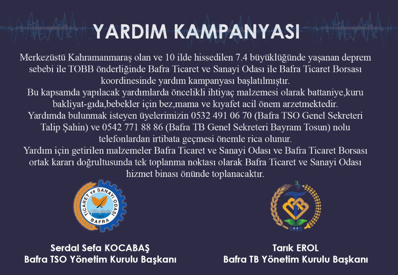 Merkezüstü Kahramanmaraş olan ve 10 ilde hissedilen 7.4 büyüklüğündeyaşanan deprem sebebi ile TOBB önderliğinde Bafra Ticaret ve SanayiOdası ile Bafra Ticaret Borsası koordinesinde yardım kampanyasıbaşlatılmıştır.Bu kapsamda yapılacak yardımlarda öncelikli ihtiyaç malzemesi olarakbattaniye,kuru bakliyat-gıda,bebekler için bez,mama ve kıyafet acil önemarzetmektedir.Yardımda bulunmak isteyen üyelerimizin 0532 491 06 70 (Bafra TSO GenelSekreteri Talip Şahin) ve 0542 771 88 86 (Bafra TB Genel SekreteriBayram Tosun) nolu telefonlardan irtibata geçmesi önemle rica olunur.Yardım için getirilen malzemeler Bafra Ticaret ve Sanayi Odası ve BafraTicaret Borsası ortak kararı doğrultusunda tek toplanma noktası olarakBafra Ticaret ve Sanayi Odası hizmet binası önünde toplanacaktır.