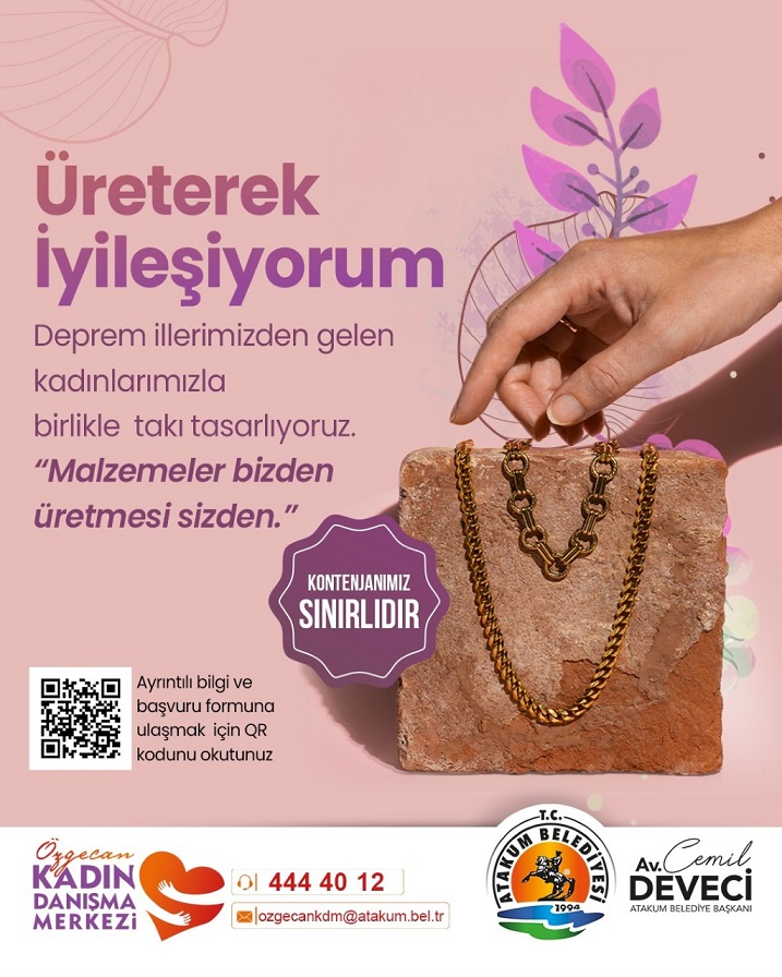 Atakum Belediyesi ve Özgecan Kadın Danışma Merkezi iş birliği ile Samsun’da yaşamını devam ettiren depremzede kadınlara yönelik “Üreterek İyileşiyorum” projesi başlatılıyor. Proje kapsamında afet bölgesinden gelen vatandaşlara takı tasarımı eğitiminin yanı sıra psikolojik danışma hizmeti verilecek. Depremzede kadınların el becerilerini geliştirerek ev ekonomilerine katkı sağlayacak çalışmada psikolog desteği ile de deprem yaralarının sarılması hedefleniyor. Takı tasarım malzemelerinin Atakum Belediyesi tarafından karşılanacağı kurs için internet üzerinden https://forms.gle/Bp3k4T1GcHgcKMQbA
