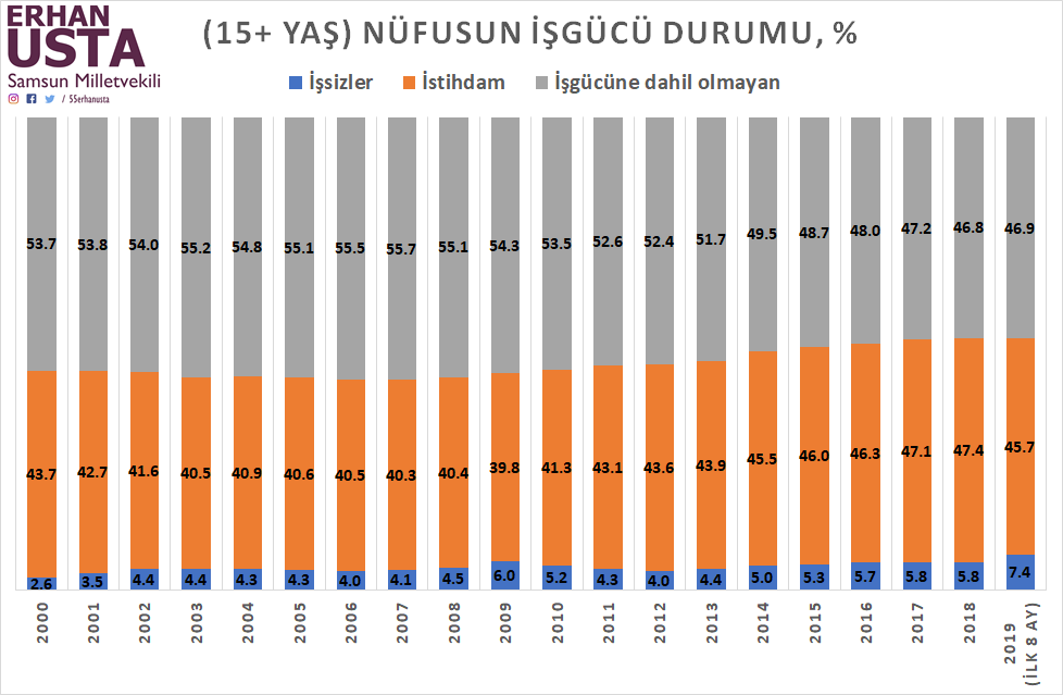 2002 yılında 15+yaş nüfusta her 100 kişiden 41,6’sı istihdamda, 4,4’ü işsizken; 2018 yılında 47,4’ü istihdamda, 5,8’i işsizdir. 2019’un ilk 8 ayında ise, istihdam 45,7’e düşmüş, işsizler ise 7,4’e çıkmıştır. 2019 yılında işgücüne katılım oranı 2018’e göre 0,1 puan düşmüştür.