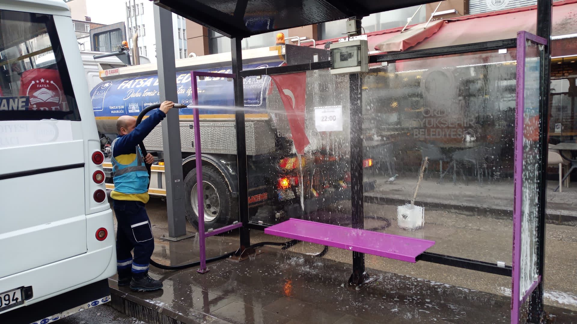 Fatsa Belediyesi Temizlik İşleri Müdürlüğü Yıkama Birimi, her gün 20 bin Fatsalının taşındığı toplu ulaşım araçları duraklarında detaylı temizleme ve dezenfeksiyon çalışması yapmaya devam ediyor.Çok sayıda vatandaşa hizmet veren dolmuş duraklarında hastalıklara karşı önlem almak amacıyla çalışmalarına ara vermeden devam eden Fatsa Belediyesi Temizlik İşleri Müdürlüğü Yıkama Birimi, halk sağlığını ön planda tutarak şehrin farklı bölgelerinde bulunan kapalı ve açık otobüs duraklarında detaylı temizlik çalışmalarını hızlı bir şekilde tamamlayıp bitiriyor. Periyodik program dahilinde yapılan genel temizlik, yıkama ve dezenfekte çalışmasıyla birlikte gelişi güzel bir şekilde asılan pankartlar ve broşürler de kazınıp sökülüyor.‘EKİPLERİMİZ PERİYODİK OLARAK DURAK TEMİZLİĞİNİ YAPIYOR’Fatsa Belediyesi Temizlik İşleri Müdürü Erdem Yuva şehir merkezinden kırsala şehrin her yerinde temizlik ve hijyene önem verdiklerini belirterek, “Dolmuş duraklarımız da açık alanda çabuk kirlenebiliyor. Ekiplerimiz periyodik olarak durak temizliğini yapıyor ve aynı zamanda gelişi güzel bir şekilde asılan pankartlar ve broşürler de kazınıp sökülüyor. Çok sayıda vatandaşa hizmet veren dolmuş duraklarının temiz ve hijyenik olmasına önem gösteriyoruz” dedi.Köksal ÖNER