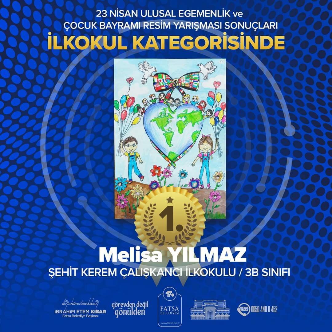 Fatsa Belediyesinin 23 Nisan Ulusal Egemenlik ve Çocuk Bayramı’nın 103’üncü yılı dolayısıyla çocuklar için düzenlediği “23 Nisan Coşkusunu Resme Sığdır” konulu resim yarışmasının sonuçları belli oldu.Fatsa Belediyesinin 23 Nisan Ulusal Egemenlik ve Çocuk Bayramı dolayısıyla “23 Nisan Coşkusunu Resme Sığdır” konulu resim yarışmasına 284 çocuk katıldı. Güzel sanatlar dalında uzman üyelerden oluşan jürinin, 220’si ilkokul kategorisinde, 182’si Ortaokul kategorisinde olmak üzere 402 resme, kompozisyon, özgünlük, armoni, temaya uygunluk ve teknik beceri olmak üzere 5 ölçüt üzerinden değerlendirme yapıldı. Resim Yarışmasında ilkokul kategorisinde Şehit Kerem Çalışkancı İlkokulundan 3’üncü Sınıf öğrencisi Melisa Yılmaz birinci olurken, Ortaokul kategorisinde ise Büyük Ata Ortaokulundan 7.Sınıf öğrencisi Esin Tüzüvcü birinci oldu.DERECEYE GİREN ÖĞRENCİLERİN İSİMLERİFatsa Belediyesi’nin; 23 Nisan Ulusal Egemenlik ve Çocuk Bayramı nedeniyle düzenlemiş olduğu ikinci geleneksel ‘Resim Yarışması’nda derece giren isimler şöyle:İlkokul Kategorisinde Birinci Şehit Kerem Çalışkancı İlkokulundan Melisa Yılmaz, İkinci Şehit Kerem Çalışkancı İlkokulundan Ece Yıldırım, Üçüncü Dumlupınar İlkokulundan Elif Çalar oldular.Ortaokul Kategorisinde Birinci Büyük Ata Ortaokulundan Esin Tüzüvcü, İkinci Büyükata Ortaokulundan Aylin Doğar, Üçüncü Şehit Ümit Karamustafa Ortaokulundan İnci Yıldırım, Jüri Özel Ödülü Fatsa Özel Eğitim Uygulama Okulundan Berat Çetinel oldular.‘BAYRAM COŞKUSU RESİMLERLE YAŞATILDI’Fatsa Belediyesi tarafından; Büyük Önder Gazi Mustafa Kemal Atatürk’ün, tüm dünya çocuklarına armağan ettiği “23 Nisan Ulusal Egemenlik ve Çocuk Bayramı” kapsamında düzenlenen resim yarışmasında, bayram coşkusunun, resimlerle yaşatıldığı yarışmada, jüri üyeleri tüm eserleri değerlendirmeye aldı. Yarışmanın jüri üyeleri; Sevda Duran, Üzeyir Koyun, Lale Karalı ve Zerrin Maden isimlerinden oluştu.‘ORTAK OLABİLDİYSEK NE MUTLU BİZLERE’Önemli bir yarışmanın olduğu hatırlatan Fatsa Belediye Başkanı İbrahim Etem Kibar, “Ulu Önderimiz Gazi Mustafa Kemal Atatürk’ün çocuklarımıza armağan ettiği bu güzel bayramı her yıl olduğu gibi bu yılda resim yarışmasıyla, taçlandırdık. Düzenlediğimiz yarışmaya katılan tüm çocuklarımıza teşekkür ediyor, dereceye giren çocuklarımızı tebrik ediyorum. Bizim gönlümüzde herkes galip” dedi.Köksal ÖNER
