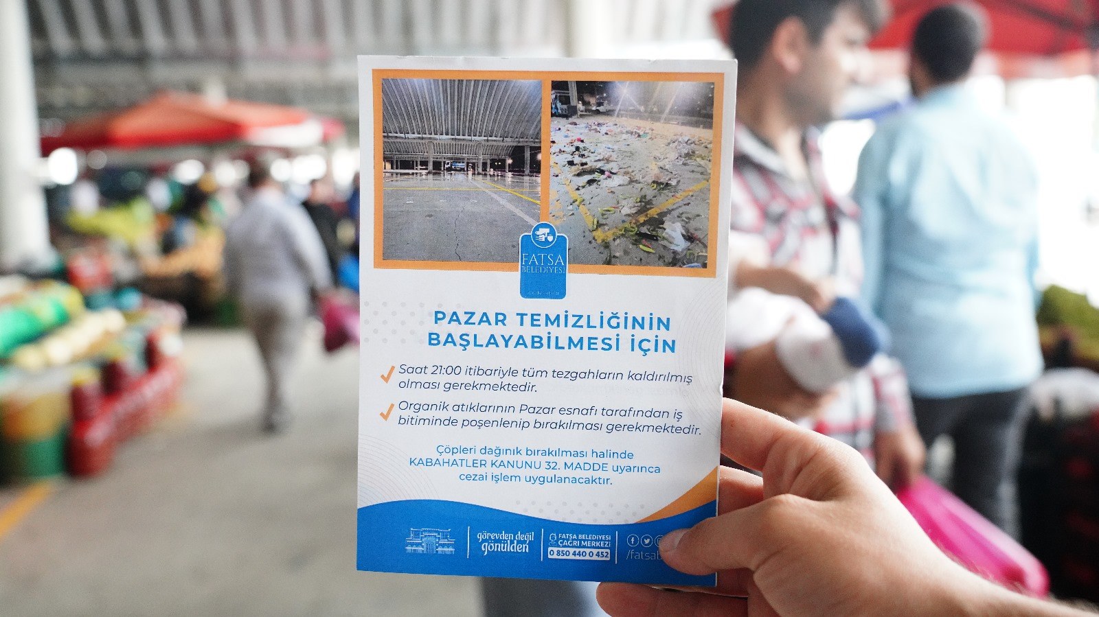 Fatsa Belediyesi Temizlik İşleri Müdürlüğü ekipleri tarafından Kapalı Pazaryeri’nde bulunan esnaflara tezgahlarını kaldırdıktan sonra bulundukları alanı temiz bırakmaları, atıklarını çöp poşetlerine koymaları anlatılarak hep sözlü hem de broşürlü uyarılarda bulunuldu.Fatsa Belediyesi Temizlik İşleri Müdürü Erdem Yuva konuyla ilgili yaptığı açıklamada pazarcı esnafının pazaryerinin kapanış saati olan 21:00 itibarıyla tezgahlarını kaldırmış olmaları gerektiğini belirterek, “Kurallara uymayan pazarcı esnafları tespit edilerek Kabahatler Kanununa göre ceza-i işlem uygulanacak” dedi. ‘HAFTANIN 6 GÜNÜ PAZAR KURULUYOR’Fatsa’da Pazartesi günü büyük Kapalı Pazar’ın yanı sıra, “Salı günü Evkaf mahallesinde, Perşembe günü Kurtuluş mahallesi Reşadiye Caddesinde, Cuma Günü Yalıköy mahallesinde, Cumartesi ve Pazar günü Sakarya Ortaokulu mevkiinde Pazar kurulduğunu ifade eden Fatsa Belediyesi Temizlik İşleri Müdürü Erdem Yuva, “Fatsa nüfus olarak her geçen gün büyüyor ve gelişiyor. Buna bağlı olarak da haftanın 6 günü pazar kuruluyor ve büyük bir yoğunluk oluşuyor. Akşam saatlerinde Pazar dağıldığında esnafların bıraktığı çöpler yüzünden bir görüntü kirliliği oluşuyor. Biz de bu anlamda pazarcı esnafımıza yönelik Zabıta Müdürlüğümüz eşliğinde uyarılarımızı yaptık. Esnaflarımıza bulundukları alanı temiz bırakmaları ve çevre kirliliğine karşı duyarlı olmaları gerektiğinin önemini anlattık.” diye konuştu.Köksal ÖNER