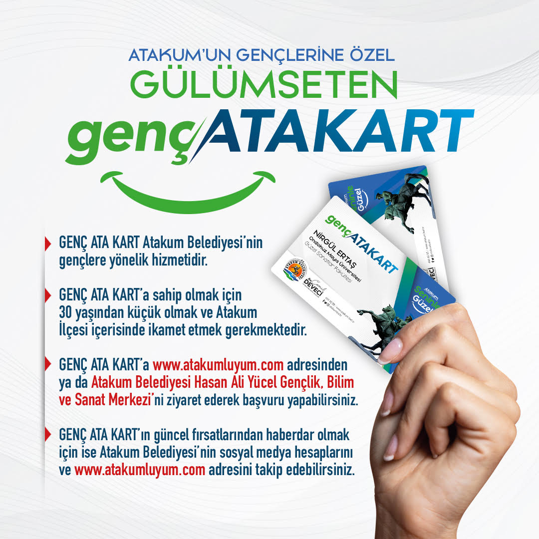 Atakum Belediyesi’nin gençlere yönelik hizmeti olan Genç Ata Kart adresi Atakum’da bulunan 30 yaşından küçük gençler için avantajlar sağlıyor. Öğrencilerin bütçelerine destek sağlamak adına hazırlanan Genç Ata Kart, özel indirim fırsatlarına sahip olacak. Adresi Atakum’da bulunan gençler Genç Ata Kart’a www.atakumluyum.com adresinden ya da Atakum Belediyesi Hasan Ali Yücel Gençlik, Bilim ve Sanat Merkezi’nden başvurabilecek. Genç Ata Kart’ın güncel fırsatları ise Atakum Belediyesi’nin sosyal medya hesaplarından ve www.atakumluyum.com adresinden takip edilebilecek.