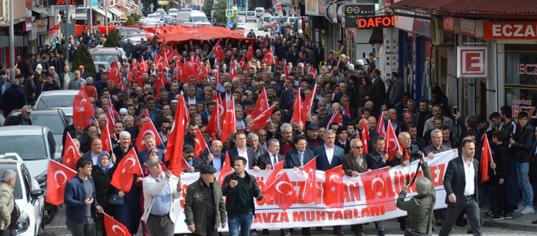Havzalı muhtarların girişimleri ile “Şehitlerimize Saygı Yürüyüşü ve Mitingi” düzenlendi. Kortej açılan 100 metrelik bayrak eşliğinde yürüdü.