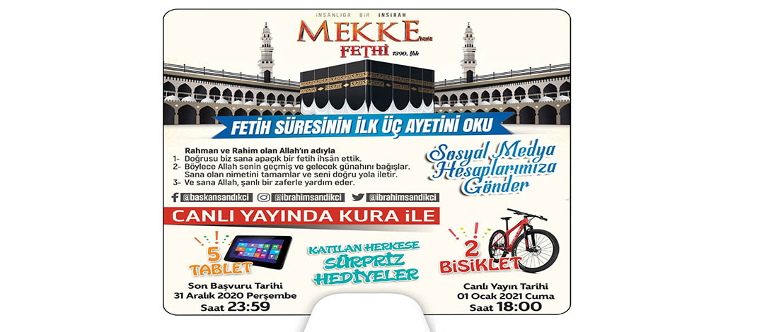 Geçtiğimiz günlerde çocuklar ve gençleri sosyal aktivite alanında tutabilmek için hazırladığı “ Hayalinde ki yeni yıl” ödüllü resim, şarkı ve şiir etkinliği devam eden Canik Belediyesi, Mekke’nin Fethi ile ilgili yine ödüllü bir etkinlik başlattı.