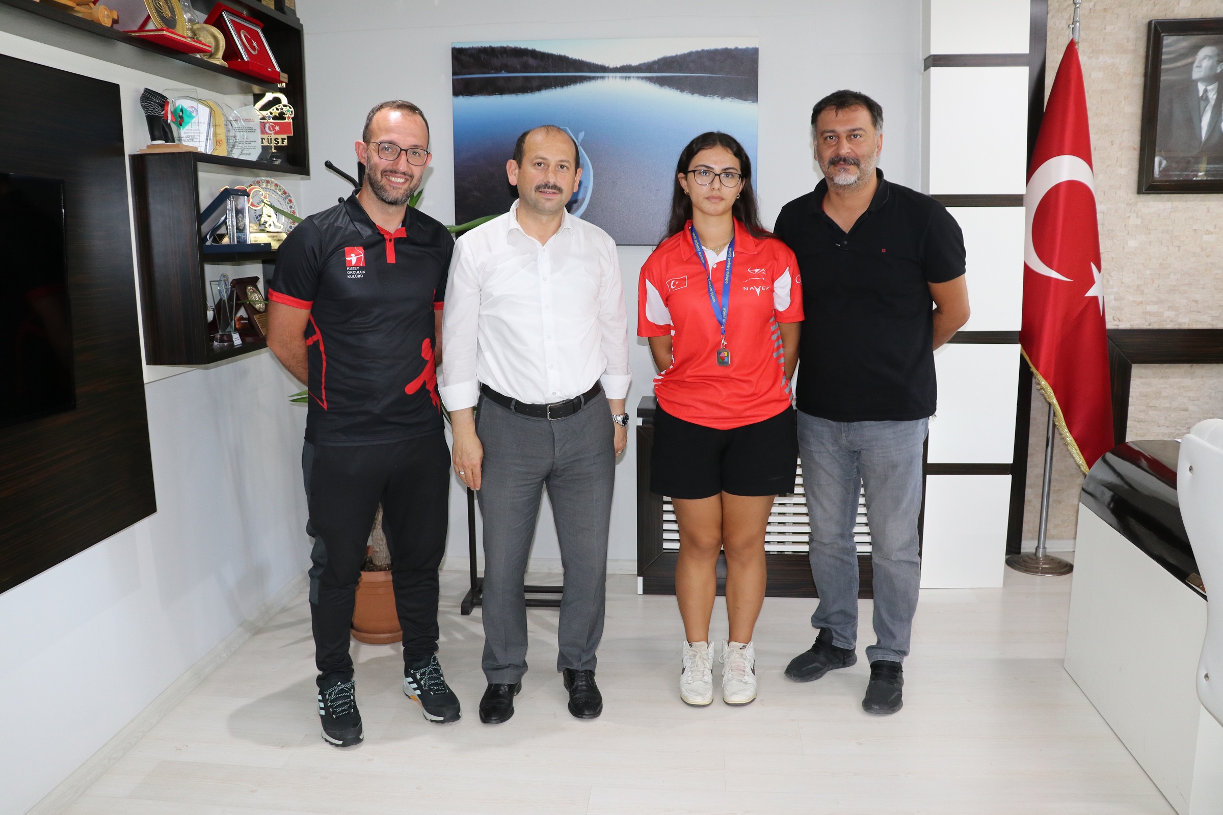 2024 Avrupa Gençlik Şampiyonası’nda ikinci olan Samsunlu Milli Okçumuz Canse Duru Tarakçı, Samsun Gençlik ve Spor İl Müdürü Feyzullah Dereci’yi ziyaret etti. Ziyarette, Canse’nin antrenörü Ramazan Can Adem ve babası Seçim Tarakçı da yer aldı. İl Müdürü Feyzullah Dereci, sporcunun başarısından dolayı büyük gurur duyduklarını belirterek, “Başarılarının devamını diliyorum. Gençlerimizi desteklemek bizim görevimiz” dedi. Canse Duru Tarakçı, ziyarette şampiyona sürecini ve hedeflerini paylaştı. Bu tür başarıların, genç sporcuların motivasyonunu artırdığını vurgulayan İl Müdürü Feyzullah Dereci, Samsun’un spor alanındaki potansiyelini geliştirmek için çalışmalara devam edeceklerini ifade etti.