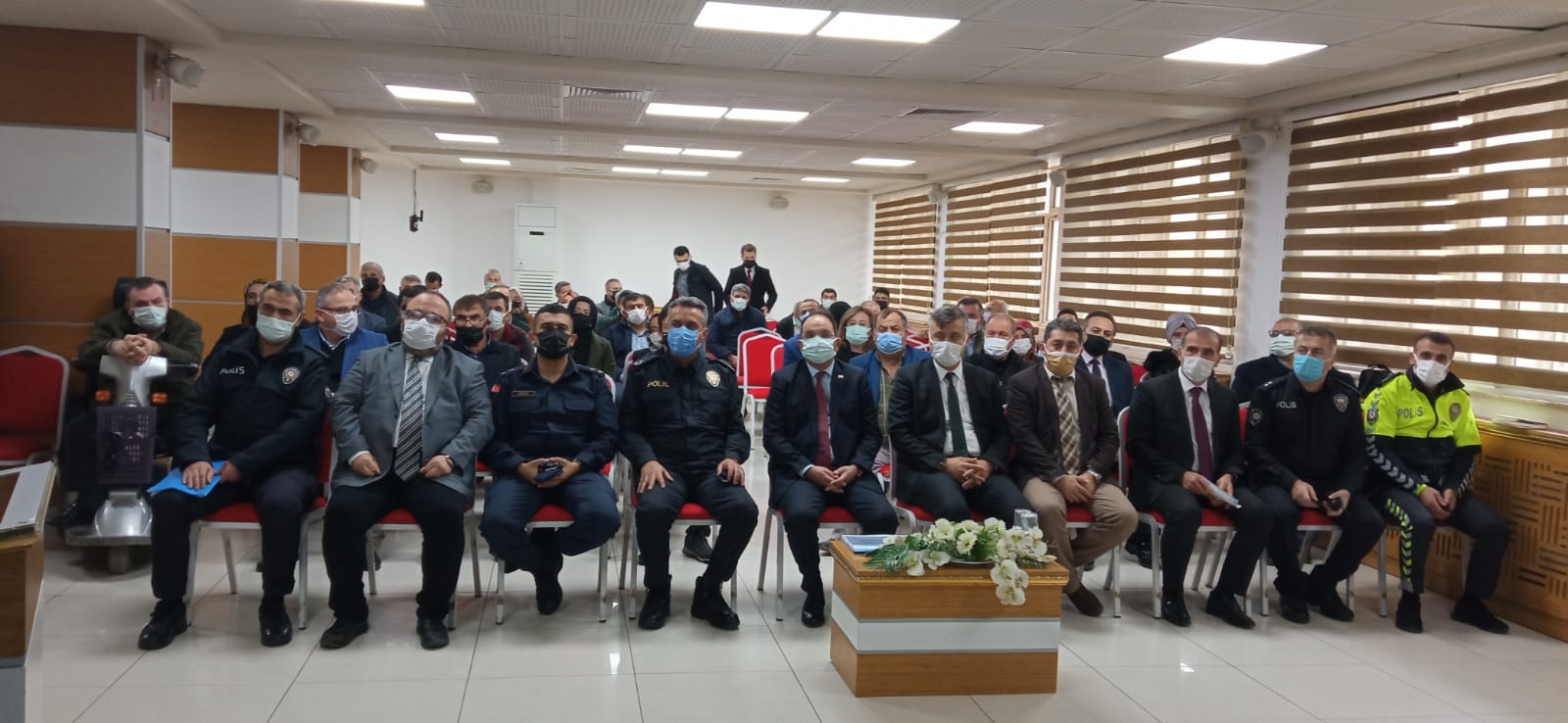 Toplantıya İlçe Emniyet Müdürü Bünyamin Temur, İlçe Jandarma Komutanı Kıdemli Üsteğmen Fatih Özer, daire amirleri, Muhtarlar, Dernek Başkaları, okul aile birliği başkanları ve davetliler katıldı.