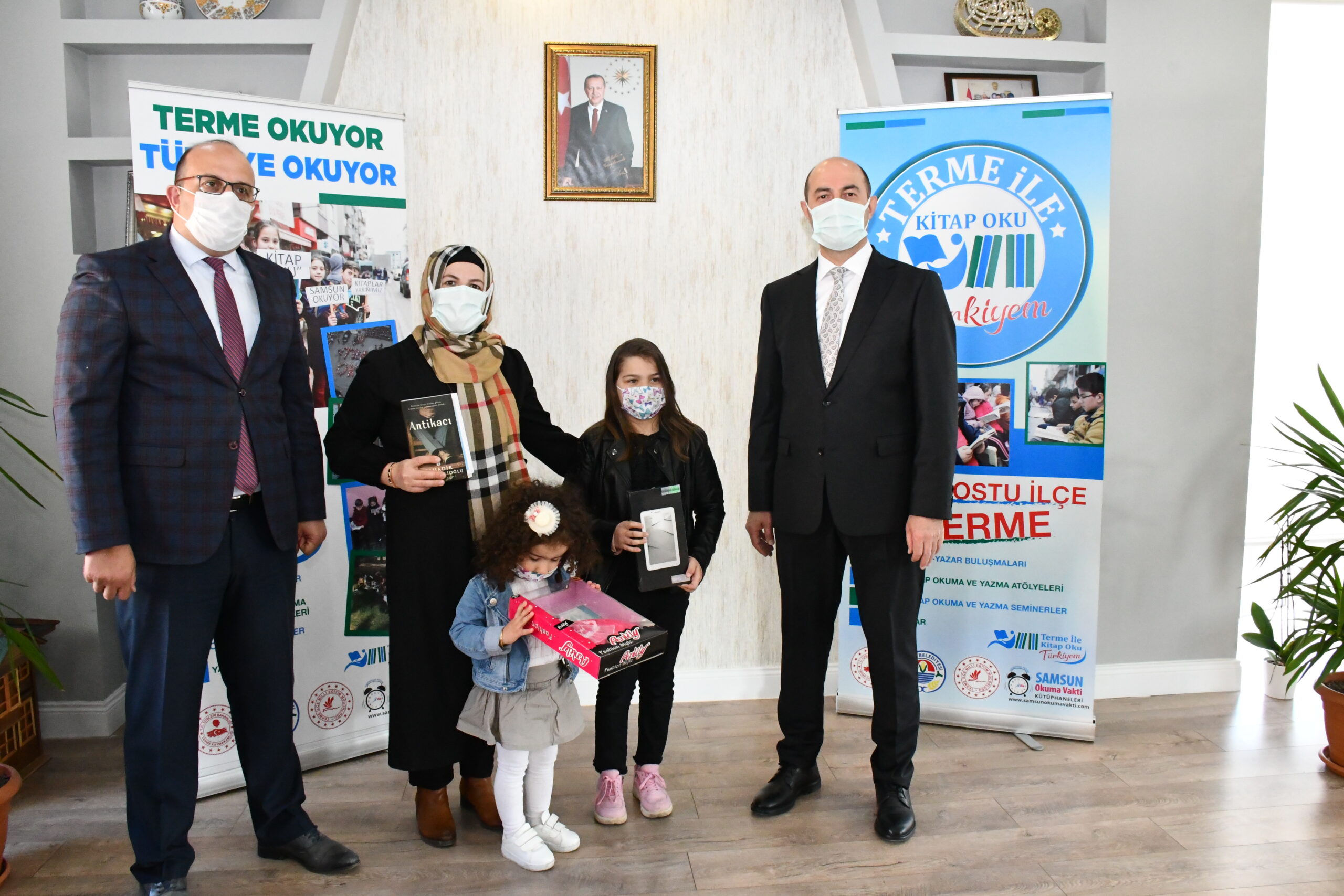 Terme Belediyesi, Terme Kaymakamlığı ve İlçe Milli Eğitim Müdürlüğü tarafından yürütülen “Terme İle Kitap Oku Türkiyem” kampanyası devam ediyor. Proje kapsamında gerçekleştirilen yarışma ve online söyleşilerde ödül kazananlar hediyelerini Terme Belediye Başkanı Ali Kılıç ve İlçe Milli Eğitim Müdürü Özer Ersoy’un elinden aldı. Mayıs ayına kadar sürecek proje kapsamında onlarca tablet ve binlerce kitap dağıtılmaya devam edecek.