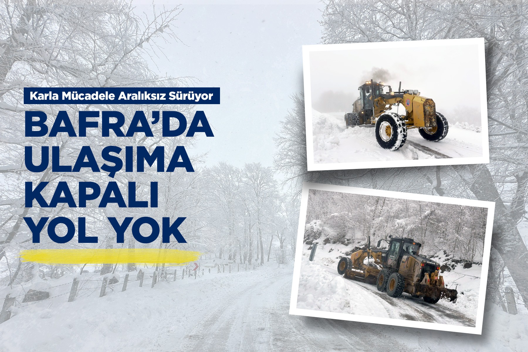 Bafra Belediyesi Fen İşleri Müdürlüğü ekipleri kar yağışının devam ettiği noktalarda kapanan yollara anında müdahale ederek vatandaşların ulaşım konusunda sorun yaşamaması için çaba gösteriyor.