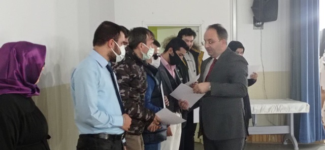 Kaymakam Cevdet Ertürkmen, Bafra Halk Eğitim Merkezi Müdürlüğü ile Bafra Görme Engelliler Derneği Başkanlığı’nın işbirliğinde “Diksiyon Spikerlik, Diksiyon Sunuculuk ve Santralist” konularında açılan kurslar sonucunda 40 kursiyer için Bafra Belediyesi Kültür Merkezinde düzenlenen törene katıldı. Kursiyerlere belgelerini taktim eden Kaymakam Cevdet Ertürkmen yaptığı konuşmasında, kursların hazırlanmasında emeği geçen yetkililere ve öğretmenlere teşekkür ederek, belgelerini alan kursiyerlere de başarılarının devamını diledi.